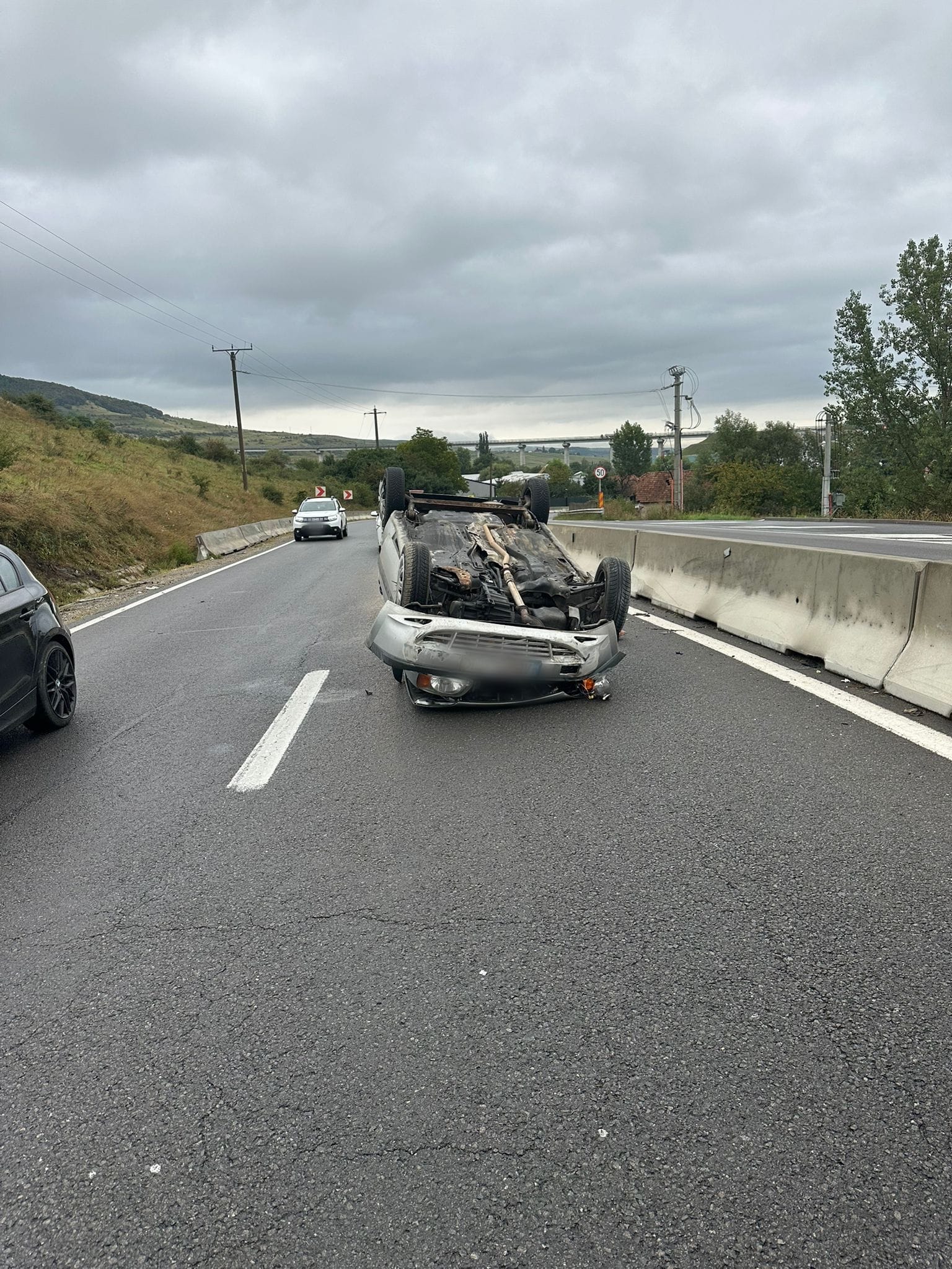 O mașină s-a răsturnat în această dimineață în Cluj, pe DN1E60, cel mai periculos drum din județ.