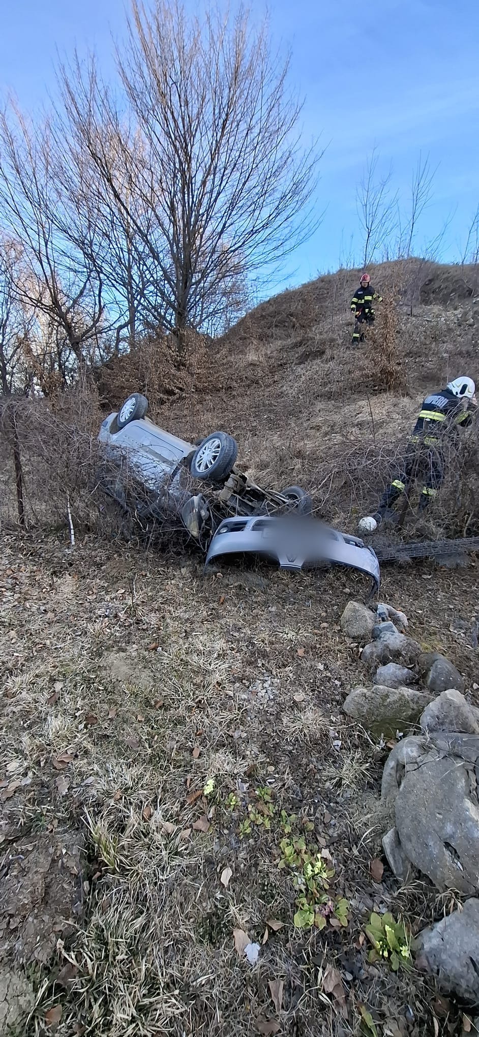 O mașină s-a răsturnat într-o râpă de zece metri, în această dimineață lângă Cluj-Napoca, 3 răniți, 1 dus la spital