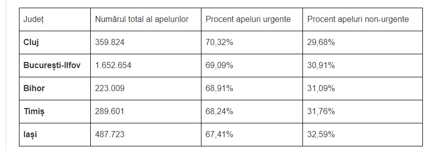 În Cluj numărul apelurilor în 2024 a ajuns la aproape 360.000, mai exact 359.824, deci în medie 1.000 de apeluri zilnic, dintre care aproape trei sferturi – 70% – au fost urgențe. Doar în București au fost înregistrate mai multe apeluri – 1,6 milioane, și în Iași – 487.700.