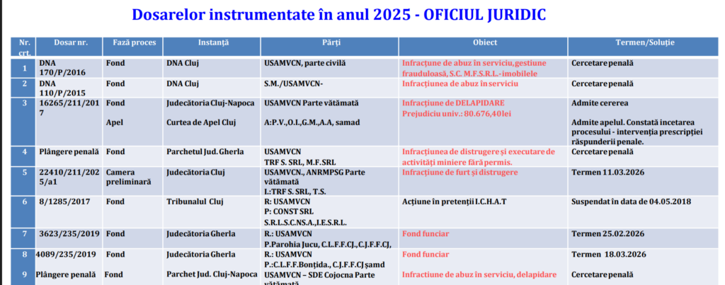 E vorba de Universitatea de Științe Agricole și Medicină Veterinară, care a publicat azi raportul de activitate pe anul trecut. Documentul include o secțiune a Oficiului Juridic în care sunt listate un număr de 69 de dosare aflate în diverse stadii procesuale. Printre acestea se numără anchete penale în curs la DNA Cluj pentru infracțiuni de abuz în serviciu și gestiune frauduloasă, un dosar de delapidare cu prejudiciu de 80.676 de lei stabilit de instanță, precum și un dosar de delapidare cercetat de Inspectoratul de Poliție Județean.
