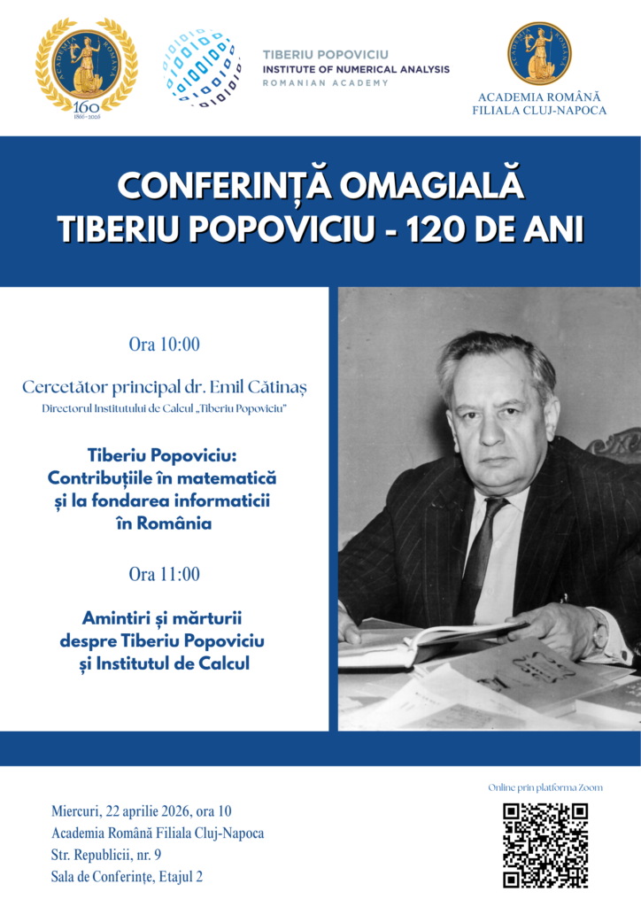 Institutul de Calcul care îi poartă numele,„Tiberiu Popoviciu” al Academiei Române Filiala Cluj-Napoca, organizează miercuri 22 aprilie o conferință dedicată împlinirii a 120 de ani de la nașterea academicianului Tiberiu Popoviciu (1906–1975). Manifestarea începe la ora 10, în sala de conferințe de la mansarda Academiei Române Filiala Cluj-Napoca de pe strada Republicii, 9, iar participarea este liberă.