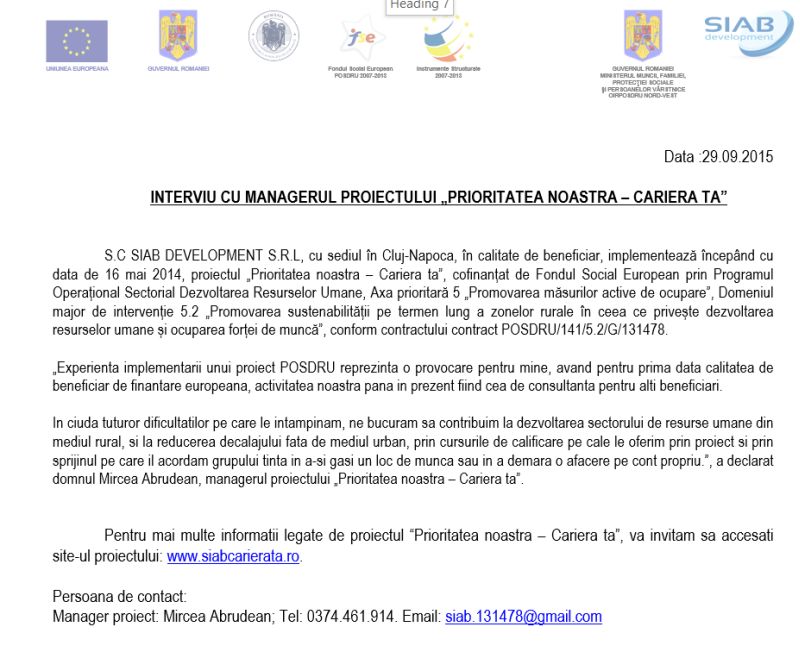 S.C SIAB DEVELOPMENT S.R.L, cu sediul în Cluj-Napoca, în calitate de beneficiar, implementează începând cu data de 16 mai 2014, proiectul „Prioritatea noastra – Cariera ta”, cofinanțat de Fondul Social European prin Programul Operațional Sectorial Dezvoltarea Resurselor Umane, Axa prioritară 5 „Promovarea măsurilor active de ocupare”, Domeniul major de intervenție 5.2 „Promovarea sustenabilității pe termen lung a zonelor rurale în ceea ce privește dezvoltarea resurselor umane și ocuparea forței de muncă”, conform contractului contract POSDRU/141/5.2/G/131478.