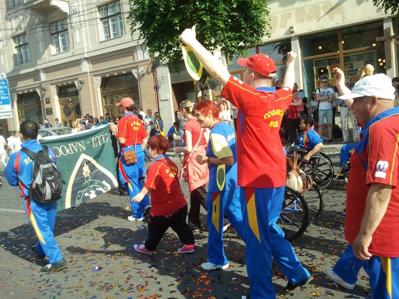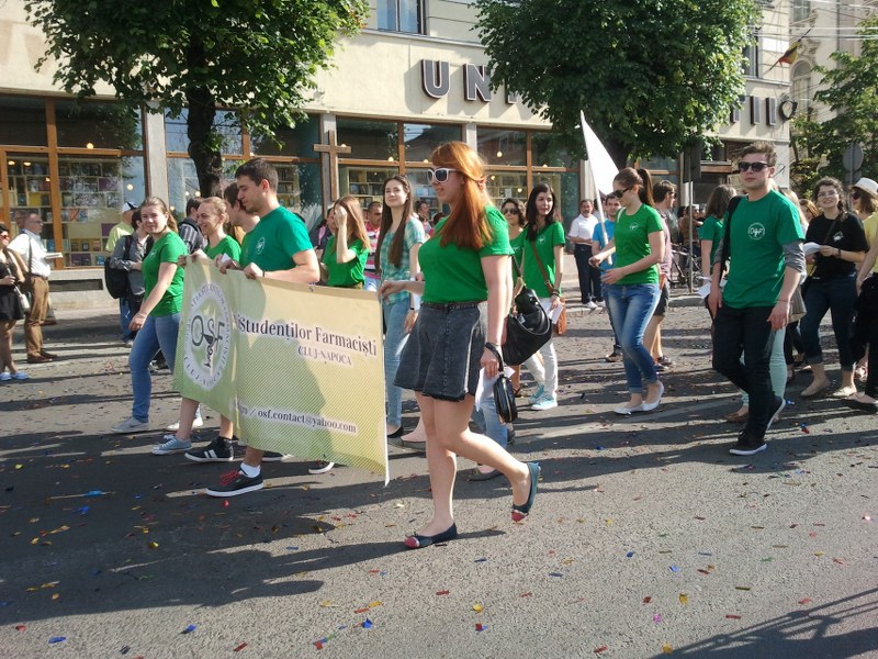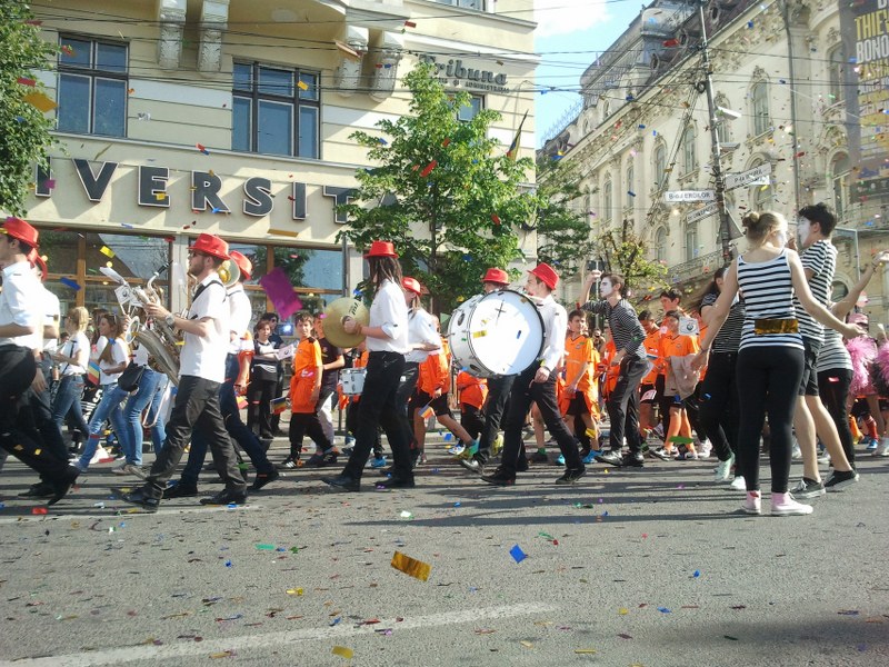Parada a fost deschisă de majoretele de la Madness UMF, multiple campioane, în tunuri de confetti – de altfel, aceasta e una dintre noutățile acestei ediții a paradei, unde miile de bucățele de confetti colorate au inundat latura sudică a pieței Unirii. Au defilat și sportivii de la „U” Mobitelco – baschetbaliștii au diseară un meci decisiv cu CSU Asesoft care stabilește care dintre cele două echipe ajunge în finală, dar și sportivii de la Universitatea Cluj, de la centrul sportiv Lamont ori de la clubul sportiv Voința, dar și studenții din organizațiile care le apără interesele, dansatoarele de la Boemdance și mai mulți pasionați înscriși în cluburi de reenactment istoric, îmbrăcați în daci, romani ori luptători medievali.