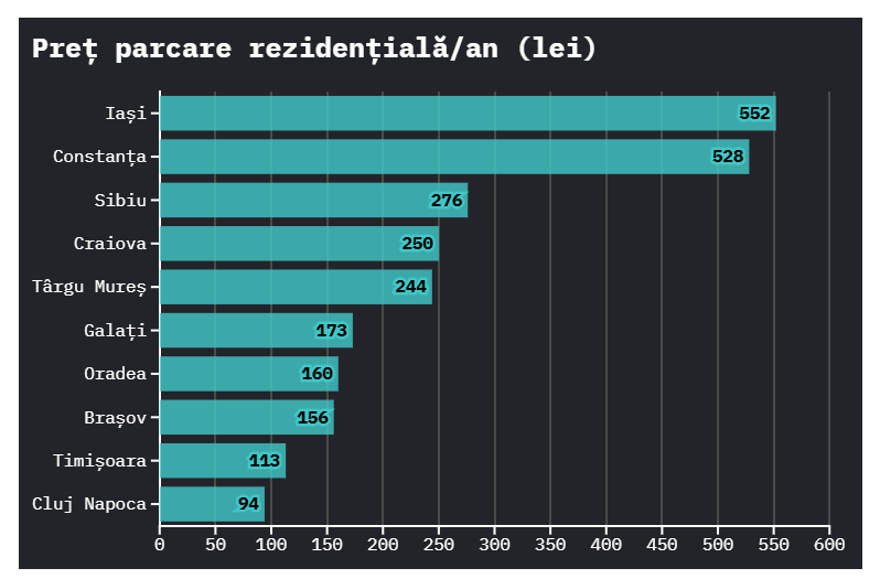 Astfel, la Iași un loc de parcare pe an costă 552 de lei, în timp ce la Constanța ajunge la 528 de lei.