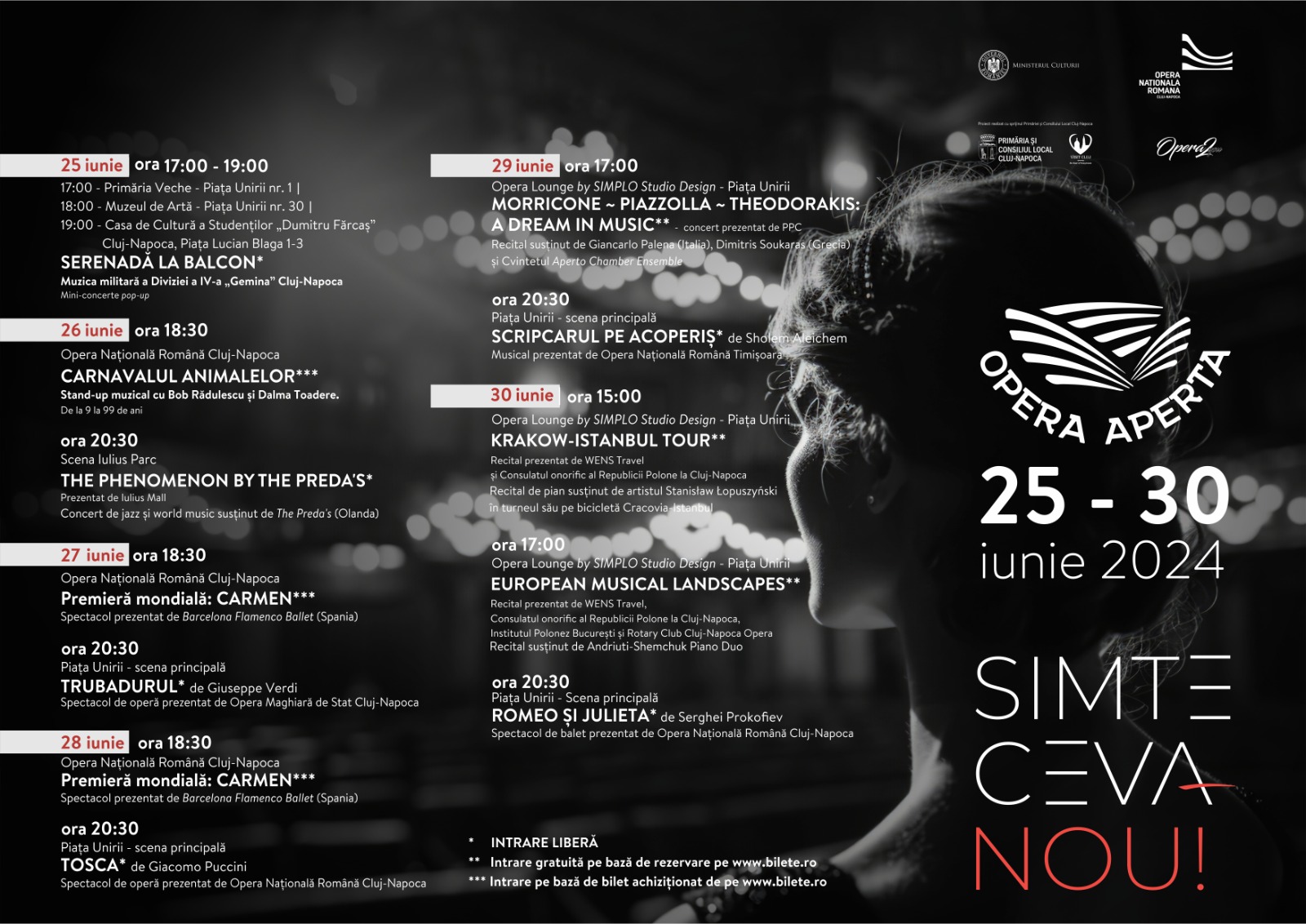 În serile de joi (27 iunie) și vineri (28 iunie), de la ora 18:30, la Opera Națională Română, Barcelona Flamenco Ballet va prezenta, în premieră mondială, versiunea adaptată a operei Carmen, care integrează accente moderne de jazz și flamenco, precum și o coregrafie spectaculoasă, semnată de talentatul dansator și coregraf catalan, David Gutiérrez. Tot joi și vineri, de la 20:30, scena din Piața Unirii va fi împărțită de cele două instituții de operă clujene,