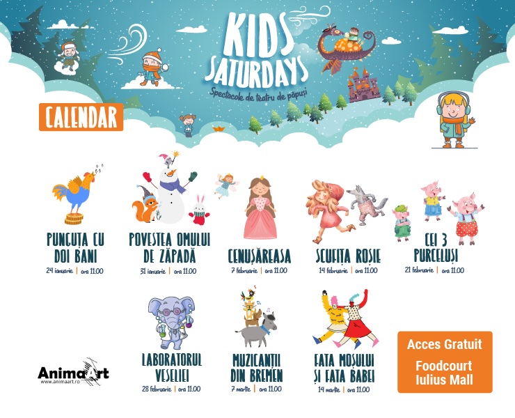 Kids Saturdays aduce bucurie în fiecare sâmbătă, cu spectacole de teatru inspirate din povești precum „Scufița Roșie”, „Cei trei purceluși”, „Laboratorul Veseliei”, „Muzicanții din Bremen” și „Fata Moșului și Fata Babei”. Programul evenimentelor poate fi consultat pe site-ul Iulius Mall Cluj.