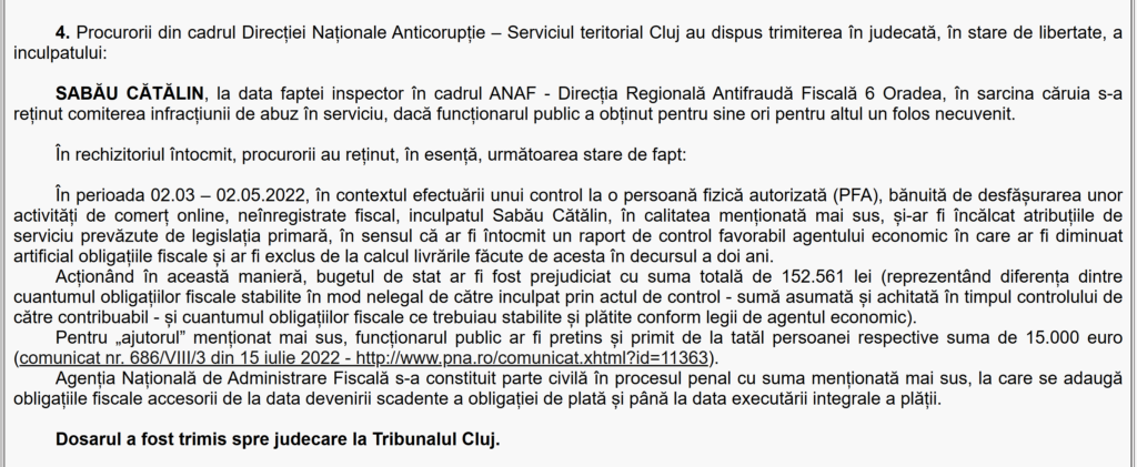 Potrivit rechizitoriului, în perioada martie–mai 2022, inspectorul Cătălin Sabău a efectuat un control la o persoană fizică autorizată bănuită că desfășura activități de comerț online neînregistrate fiscal. Procurorii anticorupție susțin că acesta și-ar fi încălcat atribuțiile de serviciu prevăzute de legislația primară, întocmind un raport de control favorabil contribuabilului, în care ar fi diminuat artificial obligațiile fiscale și ar fi exclus de la calcul livrările efectuate de acesta în decursul a doi ani.