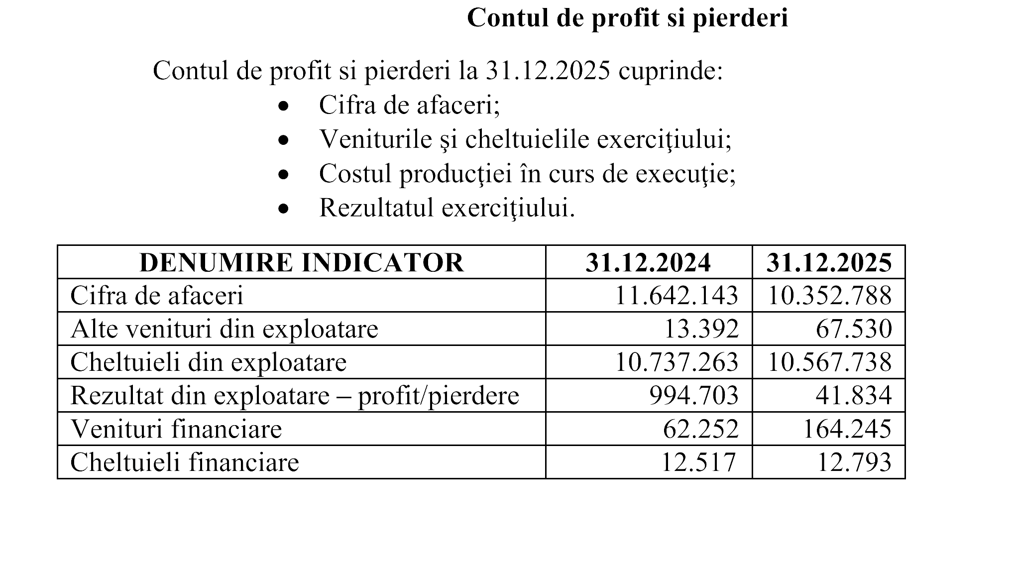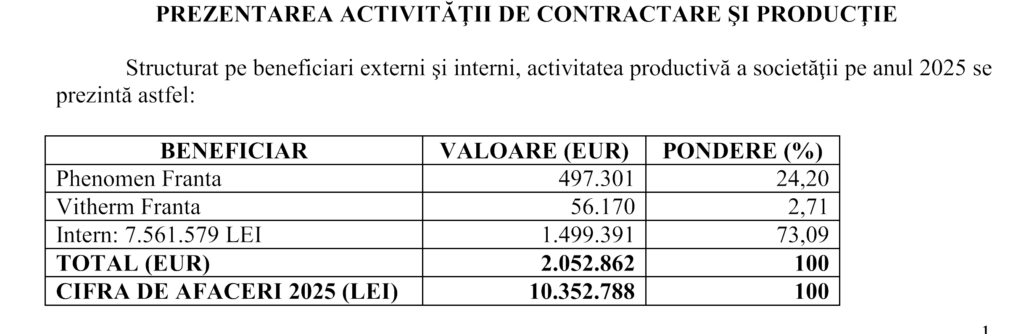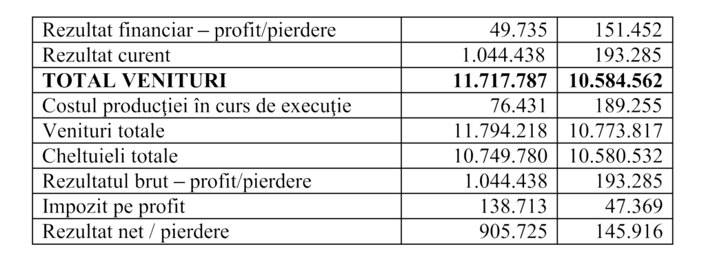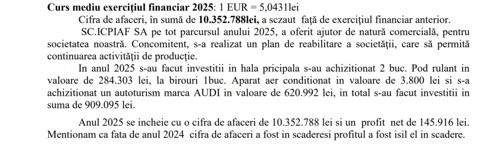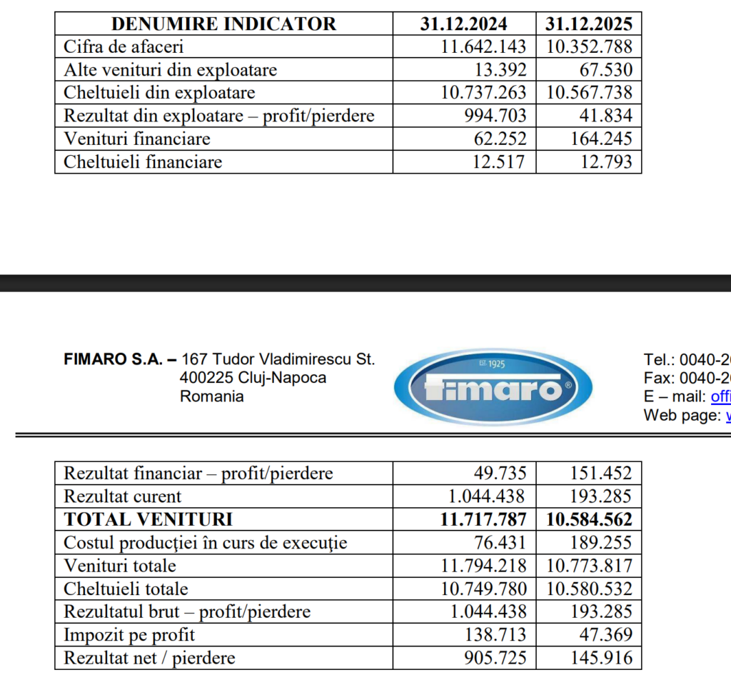 Conform raportului, cifra de afaceri a scăzut de la 11,64 milioane de lei în 2024 la 10,35 milioane de lei în 2025, iar profitul net s-a redus de la 905.725 de lei la 145.916 de lei, o contracție de aproximativ 84% față de exercițiul precedent. Profitul brut a coborât de la 1,04 milioane la 193.285 de lei. Conducerea societății recunoaște în raportul consiliului de administrație că atât cifra de afaceri, cât și profitul au fost în scădere față de 2024, fără a detalia cauzele specifice. Rezultatul din activitatea de exploatare a ajuns la doar 41.834 de lei, adică sub zece mii de euro, față de aproape un milion de lei în 2024, profitul financiar — în principal dobânzi bancare — reprezentând de fapt cea mai mare parte a profitului brut, cu 151.452 de lei.