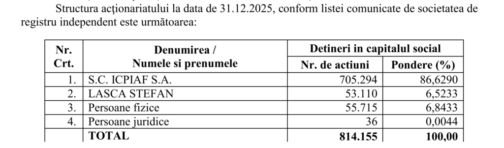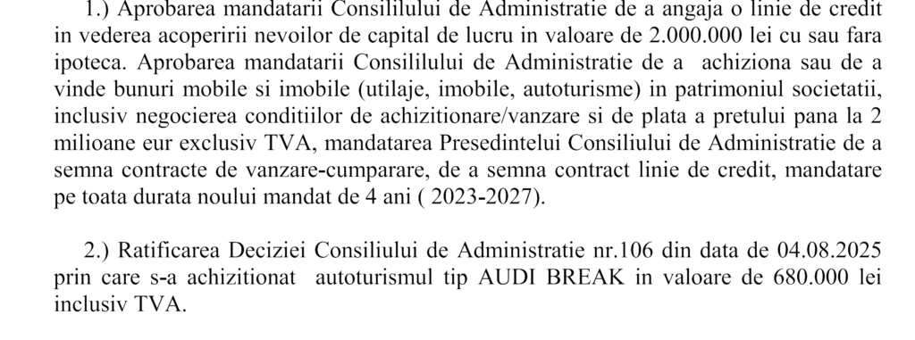 Adunarea Generală Ordinară din 25 mai, convocată pentru ora 10 la sediul companiei din strada Tudor Vladimirescu 16, va supune aprobării situațiile financiare ale anului 2025, descărcarea de gestiune a consiliului de administrație, bugetul de venituri și cheltuieli pe 2026 și ratificarea actelor de comerț efectuate de consiliu în perioada aprilie 2025 — aprilie 2026. Profitul net de 145.916 de lei este propus pentru înregistrare ca profit reportat, fără distribuire de dividende. Adunarea Generală Extraordinară, programată pentru ora 11:00 în aceeași zi, va vota mandatarea consiliului de administrație pentru contractarea unei linii de credit de până la două milioane de lei și pentru tranzacționarea de bunuri mobile și imobile în limita a două milioane de euro fără TVA, precum și ratificarea achiziției autoturismului Audi. În cazul neîntrunirii cvorumului, adunările sunt reconvocate pentru 26 mai.