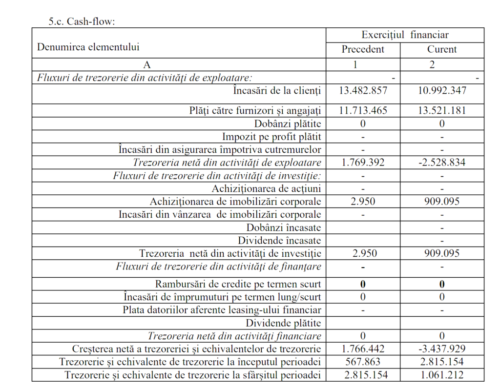 Tabloul de trezorerie indică o scădere semnificativă a lichidității. Fluxul net din activitățile de exploatare a trecut de la un surplus de 1,77 milioane de lei în 2024 la un deficit de 2,53 milioane de lei în 2025, determinat de creșterea plăților către furnizori și angajați — 13,52 milioane de lei — față de încasările de la clienți de 10,99 milioane de lei.