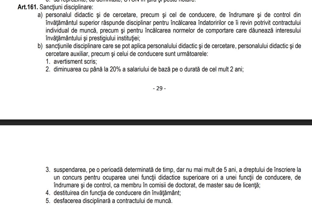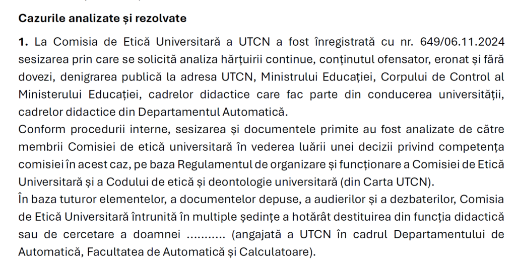 Comisia de Etică Universitară a UTCN a pronunțat în cursul anului 2025 cea mai gravă sancțiune prevăzută de regulamentul intern cu excepția desfacerii contractului de muncă: destituirea din funcția didactică a unei cadre angajate în cadrul Departamentului de Automatică, din Facultatea de Automatică și Calculatoare. Cazul este menționat în Raportul Rectorului pe anul 2025.