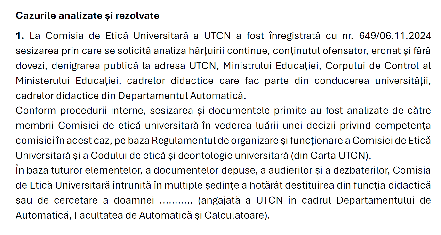 Sesizarea, înregistrată la comisie în noiembrie 2024, viza „hărțuire continuă, conținut ofensator, eronat și fără dovezi, denigrare publică” la adresa universității, a Ministrului Educației, a Corpului de Control al Ministerului, precum și a unor cadre didactice din conducerea UTCN și din Departamentul de Automatică.