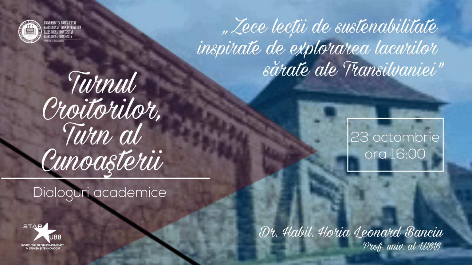 E vorba de Horia Leonard Banciu, profesor universitar al Facultății de Biologie și Geologie a universității ”Babeș-Bolyai”. Universitatea continuă joi 23 octombrie de la ora 16 seria de cursuri și prelegeri ”Studium Generale“, găzduită de Turnul Croitorilor, cu o prelegere cu tema “Zece lecții de sustenabilitate inspirate de explorarea lacurilor sărate ale Transilvaniei“. ”În cadrul prelegerii sale, profesorul Banciu va oferi o perspectivă detaliată asupra importanței lacurilor hipersaline, subliniind rolul acestora în cercetarea sustenabilității”, arată UBB.