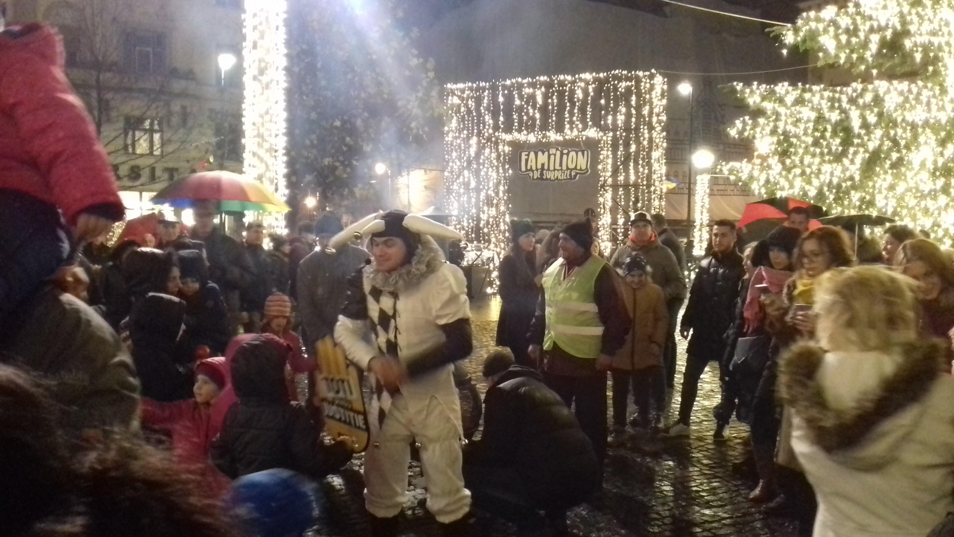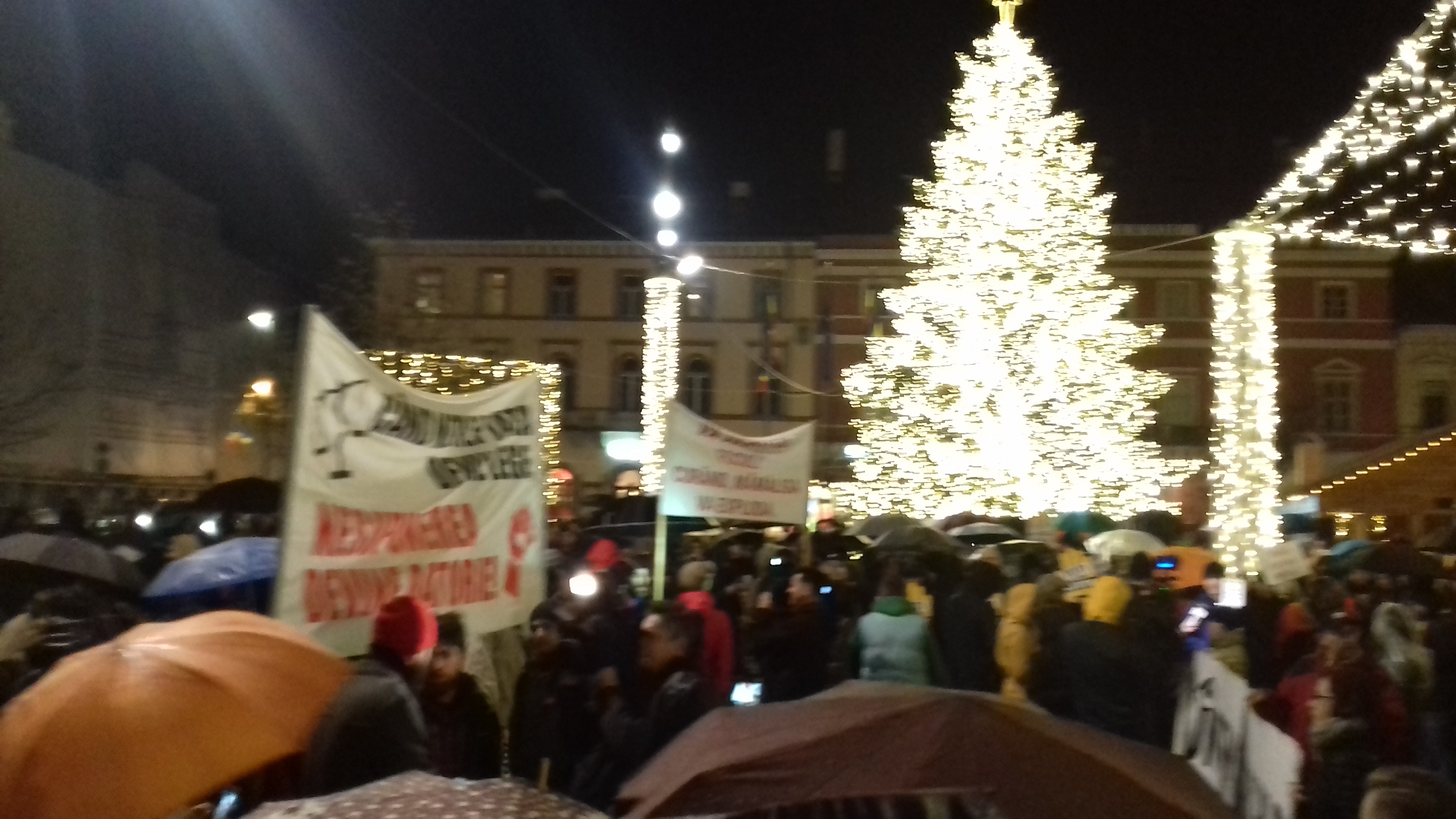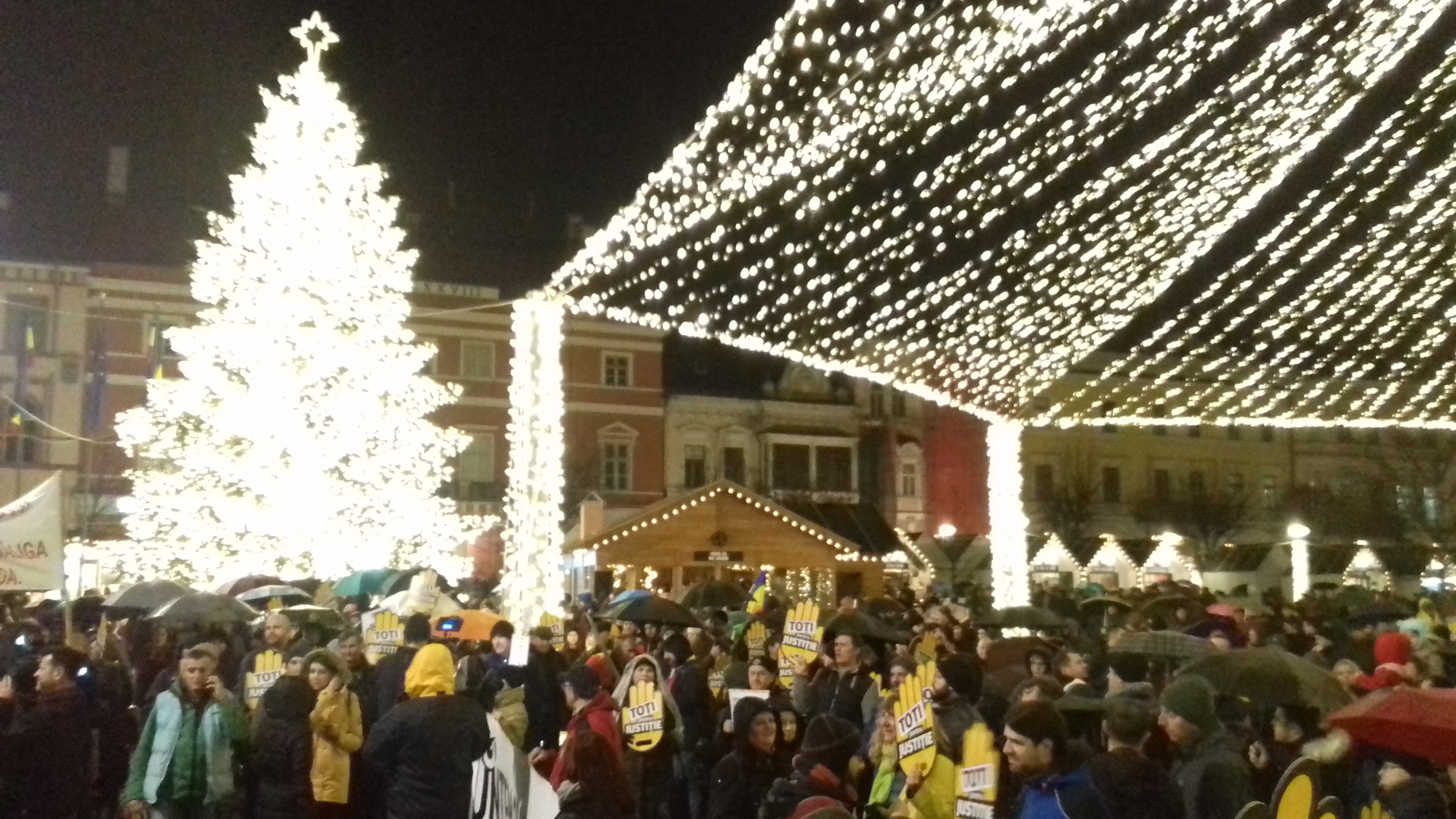 E puțin trecut de ora 18.00, ora anunțată pentru protestul împotriva noilor legi ale Justiției. Piața Unirii, loc tradițional de proteste e transformată acum în Târg de Crăciun.  Plouă și din difuzoare se aude „Jingle Bells”, iar lângă bradul uriaș cu luminițe a apărut Bufonul care spune povești. În decor au apărut și primii protestatari – au „mănuși” cu mesaj: „Toți pentru justiție”.