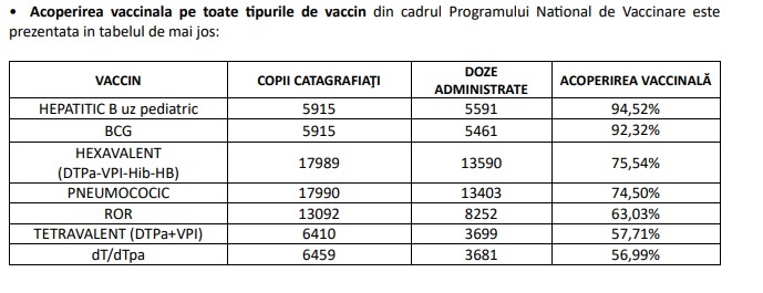Mai jos situația acoperirii vaccinale pe toate tipurile de vaccin din cadrul programului național de vaccinare; se remarcă faptul că două dintre vaccinuri ponderea e doar puțin peste jumătate. În cazul vaccinului ROR – împotriva rujeolei – acoperirea vaccinală e de asemenea redusă, la 63%.