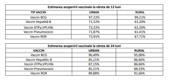 În tabelul de mai jos linia dT/dTPa se referă la acoperirea pentru rapelul adolescenților, unde acoperirea scăzută este o problemă frecventă. Vaccinul ROR este un vaccin combinat care protejează împotriva a trei boli virale: rujeola, oreionul și rubeola. Acesta conține virusuri atenuate – slăbite – și se administrează în două doze, conform calendarului național de vaccinare, pentru a asigura o protecție completă și de lungă durată.