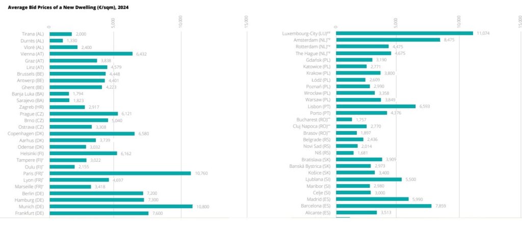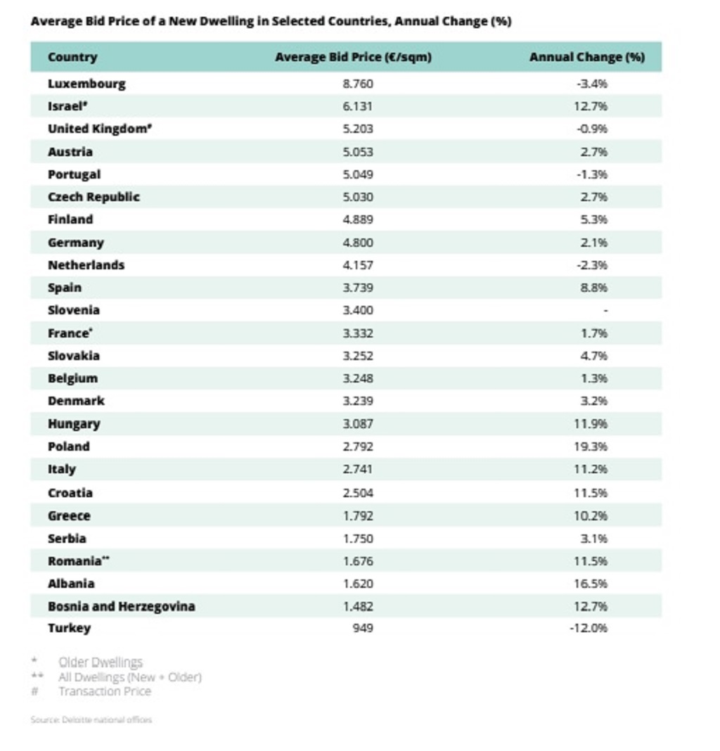 În România prețul mediu e de 1.676 euro/mp în 2024, în creştere cu 11,5% an/an. Este al patrulea cel mai mic indicator din Europa după Turcia, Bosnia şi Herţegovina şi Albania, . Cifrele se raportează la principalele oraşe din 28 de ţări. La polul opus, ţara cu cele mai scumpe locuinţe este Luxemburg, cu o medie de 8.760 euro/mp în 2024. Potrivit analizei Deloitte, 18 din cele 28 de ţări analizate au înregistrat creşteri ale preţurilor medii pentru locuinţe, cele mai importante fiind în Polonia cu o creștere de 19,3% şi Albania cu 16,5%. Scăderi notabile s-au înregistrat în Turcia, minus 12%, Luxemburg și Olanda, cu minus 3,4%, respectiv 2,3%.