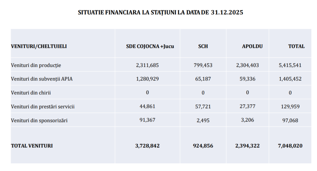 Cheltuielile salariale ale stațiunilor au însumat 4,84 milioane de lei, în condițiile în care veniturile din producție au fost de 5,41 milioane, la care se adaugă subvenții APIA de 1,4 milioane. Costurile cu forța de muncă zilieră, materialele și prestările de servicii au reprezentat un alt element semnificativ, depășind împreună 3,4 milioane de lei.