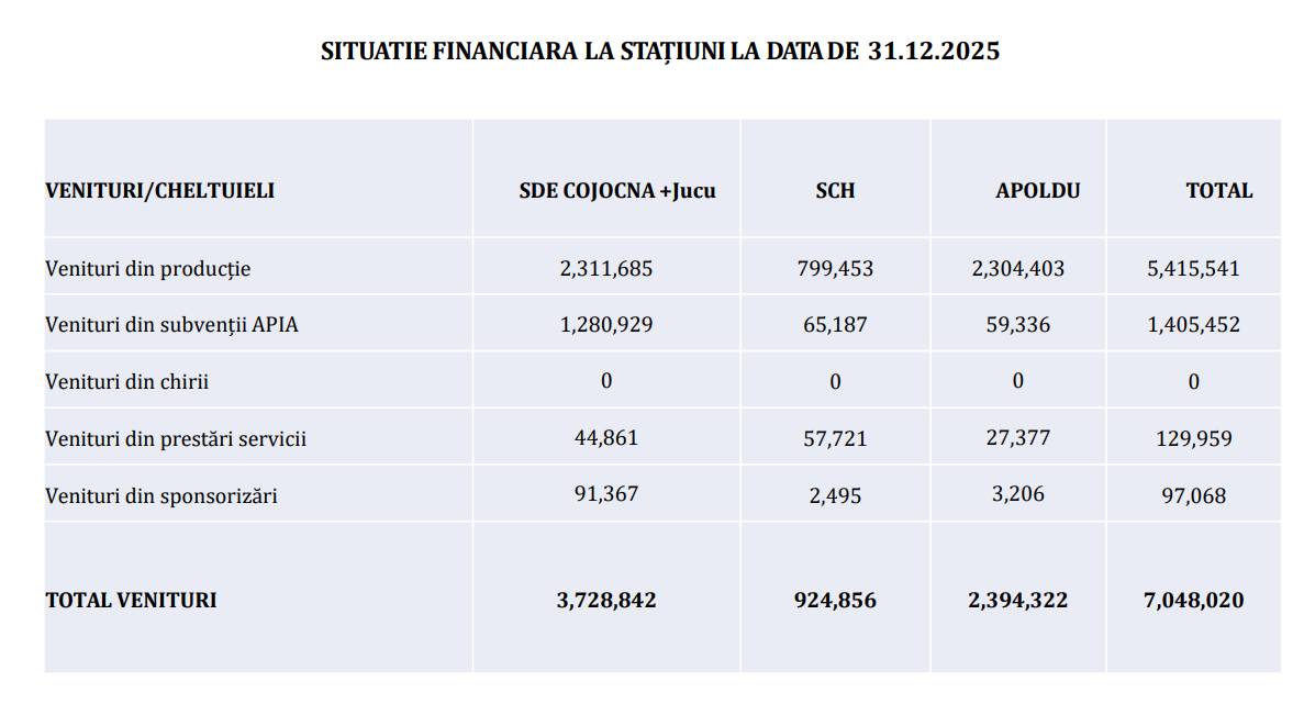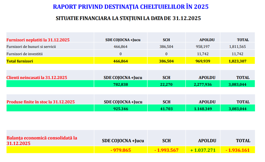 Bilanțul economic consolidat la 31 decembrie 2025 arată o pierdere netă de 1,93 milioane de lei, după includerea stocurilor de produse finite și a clienților neîncasați. La aceeași dată, furnizorii neachitați totalizau 1,82 milioane de lei, dintre care aproape un milion la stațiunea Apoldu de Sus.