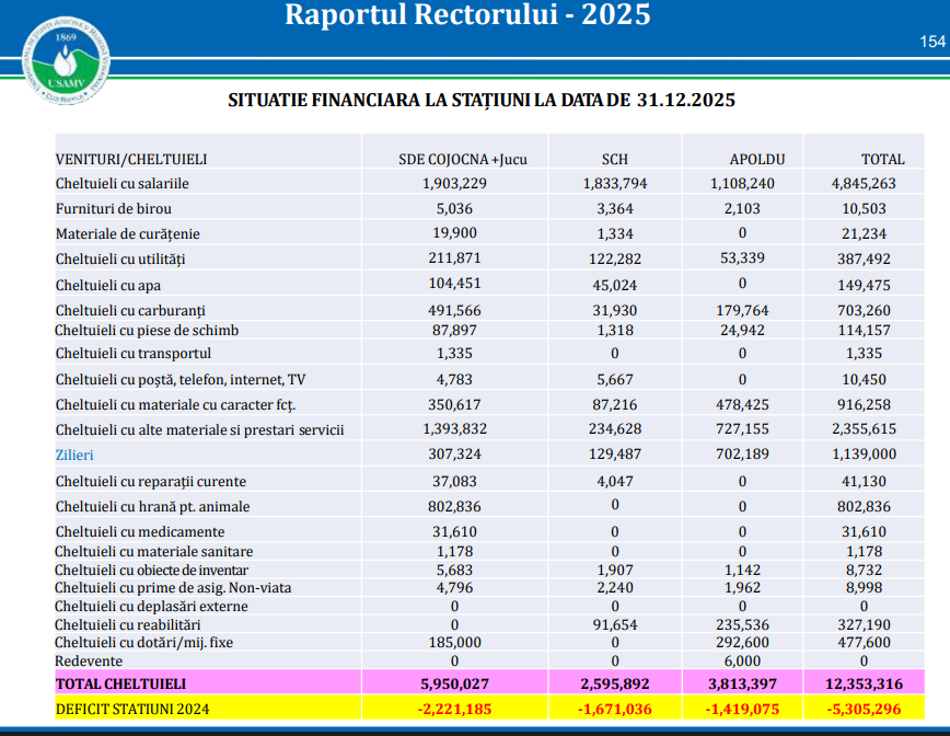 Cele trei stațiuni didactice și experimentale ale Universității de Științe Agricole și Medicină Veterinară Cluj-Napoca — SDE Cojocna împreună cu Jucu, Stațiunea de Cercetări Horticole (SCH) și Stațiunea Viticolă Apoldia Maior — au înregistrat împreună cheltuieli de 12,35 milioane de lei în 2025, față de venituri totale de 7,04 milioane de lei. Diferența, de 5,3 milioane de lei, adică peste un milion de euro, reprezintă deficitul operațional consolidat al anului, potrivit Raportului Rectorului publicat azi.