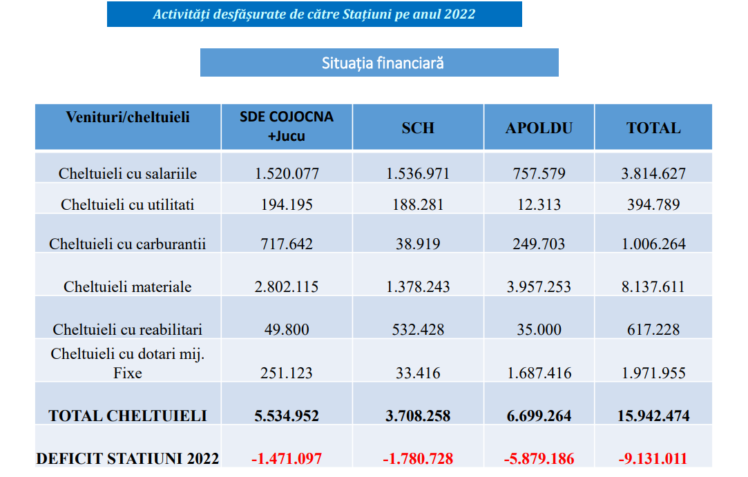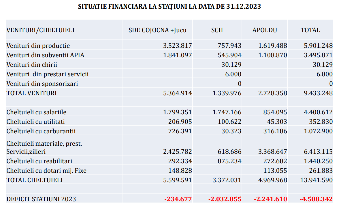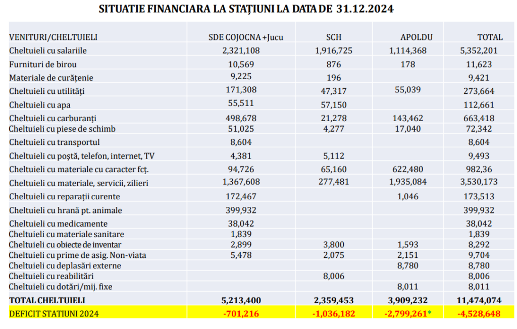 Situația cea mai gravă se înregistrează la SDE Cojocna și Jucu, unde cheltuielile au depășit veniturile cu 2,22 milioane de lei. SCH a acumulat un deficit de 1,67 milioane lei, iar Stațiunea de la Apoldu de Sus — pierderi de 1,4 milioane – toate cifrele mai jos.