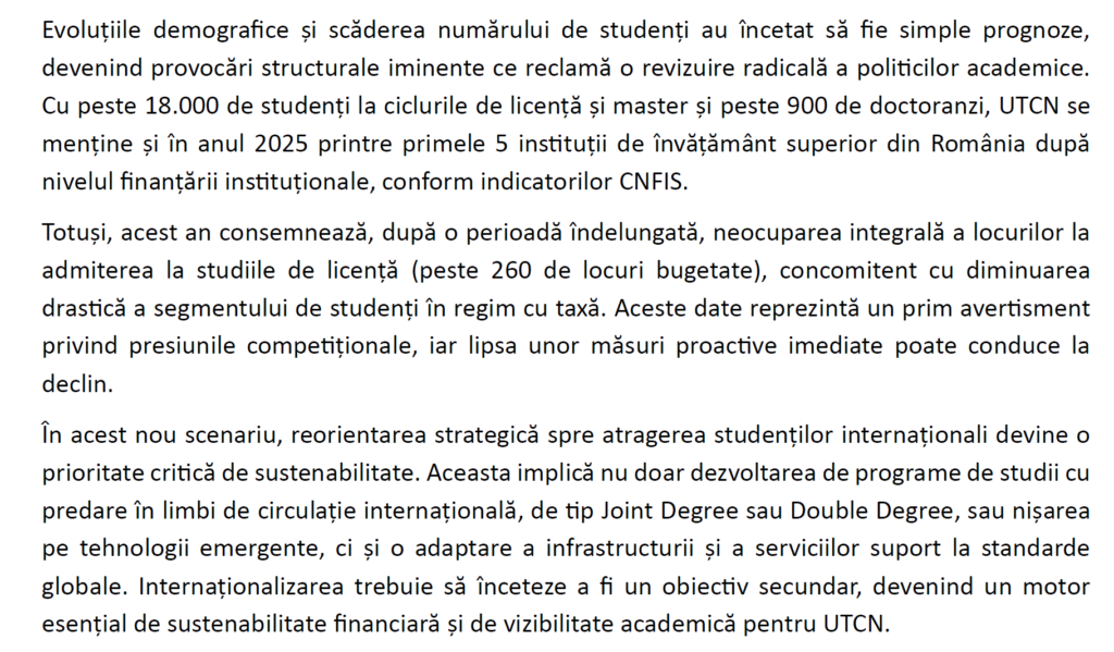 Situația este cu atât mai semnificativă cu cât UTCN se numără în continuare printre primele cinci universități din România după nivelul finanțării instituționale, cu peste 18.500 de studenți înmatriculați la ciclurile de licență și master și aproape o mie de doctoranzi.