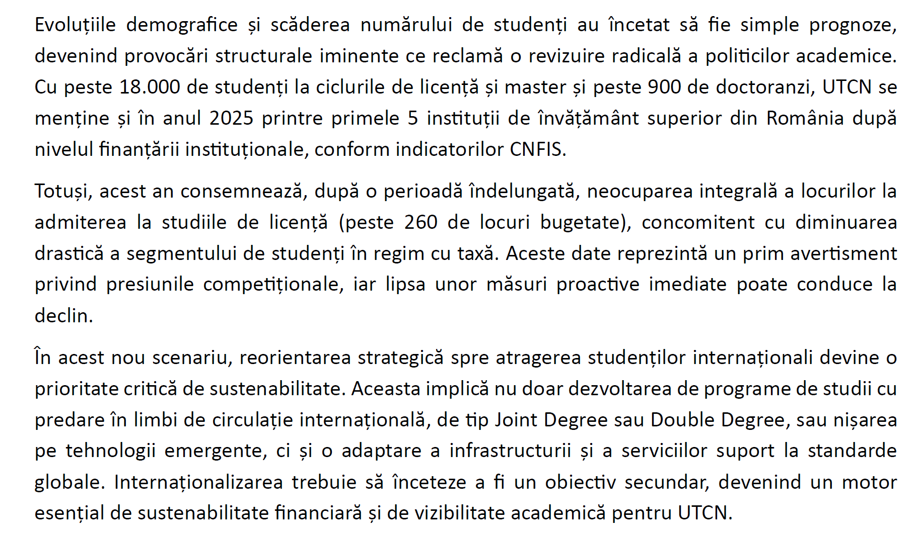 Raportul descrie această evoluție drept „un prim avertisment privind presiunile competiționale”, subliniind că lipsa unor măsuri proactive imediate „poate conduce la declin”. Conducerea universității identifică drept cauze principale tendințele demografice negative și scăderea numărului de absolvenți de liceu, fenomene care au încetat să mai fie simple prognoze și au devenit „provocări structurale iminente”.