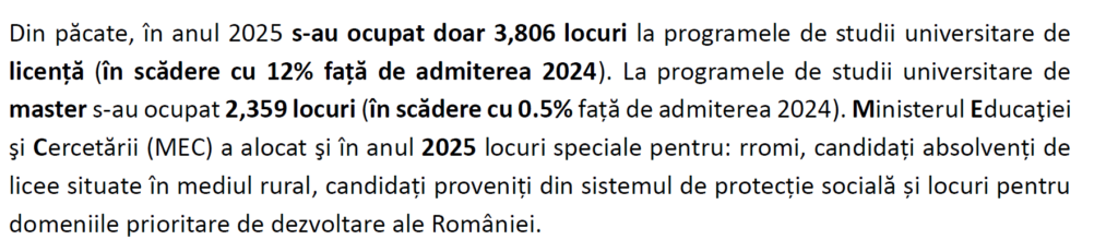 Pentru prima dată după o perioadă îndelungată, instituția nu a reușit să ocupe toate locurile bugetate la admiterea pentru studiile de licență. Potrivit Raportului Rectorului pe anul 2025, au rămas neocupate peste 260 de locuri finanțate de la bugetul de stat — o scădere de 12% față de sesiunea de admitere din 2024.