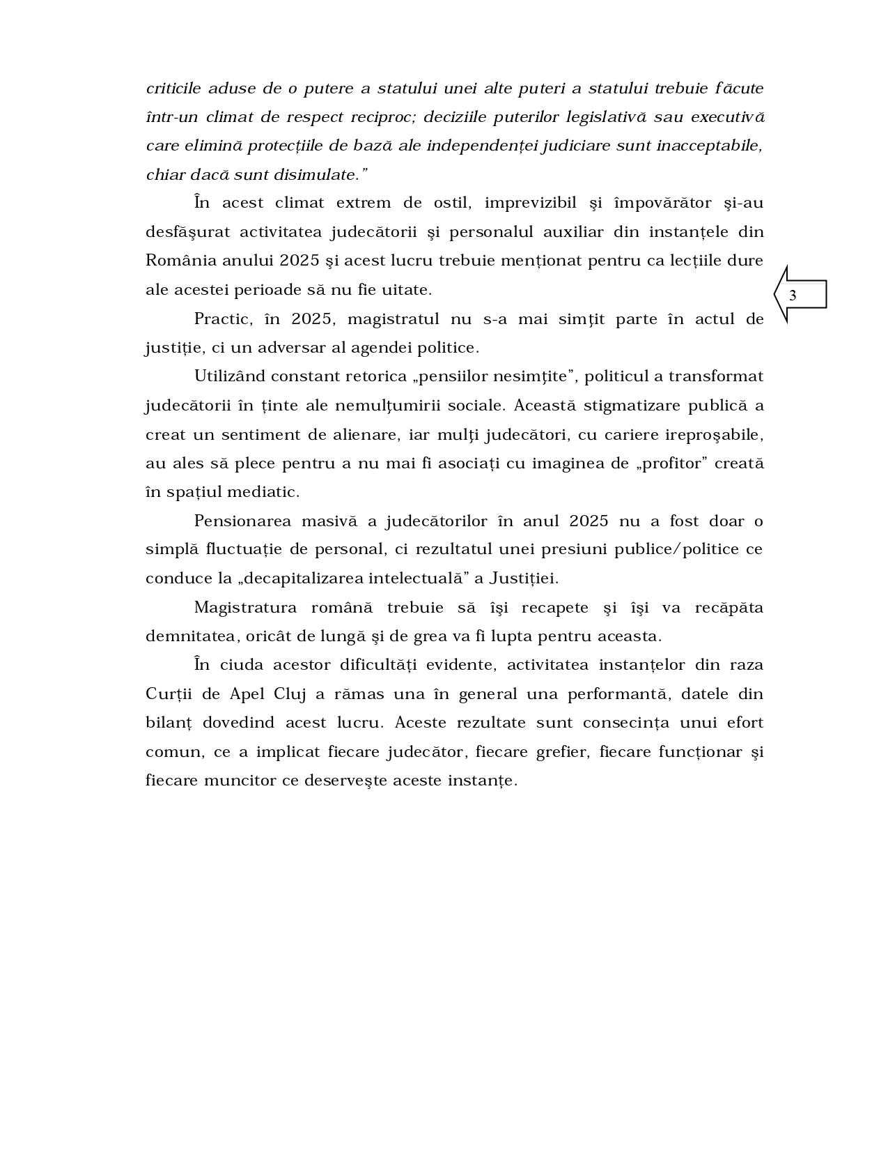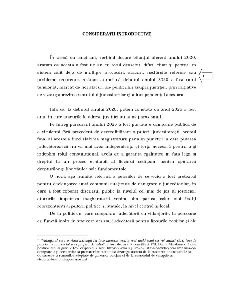 probleme recurente. Arătam atunci că debutul anului 2020 a fost unul tensionat, marcat de noi atacuri ale politicului asupra justiţiei, prin iniţiative ce vizau şubrezirea statutului judecătorilor şi a independenţei acestora. Iată că, la debutul anului 2026, putem constata că anul 2025 a fost anul în care atacurile la adresa justiţiei au atins paroxismul”, se arată în introducerea raportului Curții de Apel Cluj pentru 2025, publicat în urmă cu puține momente.
