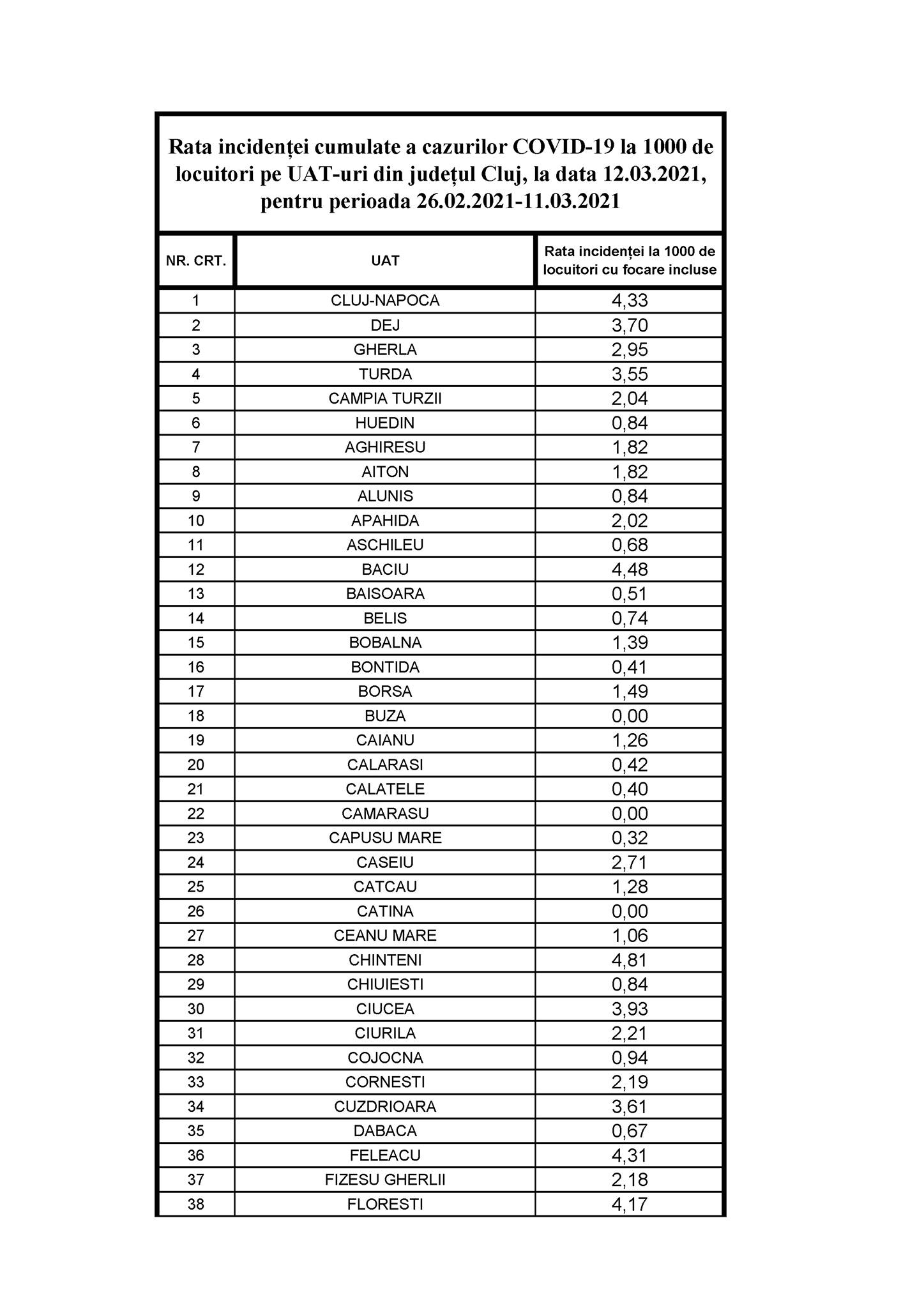 Incidența infecției e în Cluj-Napoca de 4,33 cazuri la mie azi, iar în Florești de 4,17 cazuri la mie, arată datele Comitetului Județean pentru Situații de Urgență. Peste pragul critic de trei la mie se află și Dejul cu 3,7 și Turda cu 3,55, iar Gherla se află la limită, cu o incidență de 2,95 cazuri la mie, arată aceleași date. În zona metropolitană a orașului Cluj-Napoca sunt comune cu incidență ridicată, cum e Baciu cu 4,48, Feleacu cu 4,31 și Chinteni cu 4,81 cazuri la mie. Mai jos incidența infecției în fiecare oraș și comună din Cluj, azi: