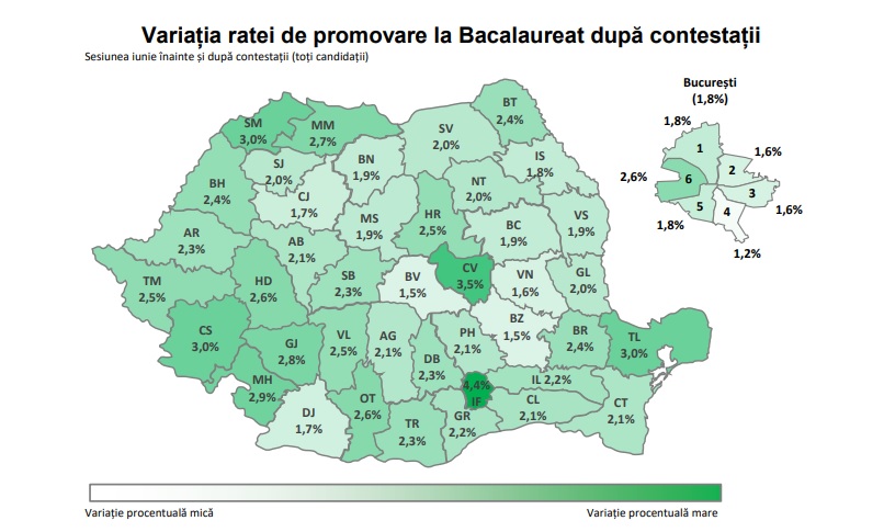 Cele mai bune procente după contestații s-au înregistart în Cluj (86,9%), Galați (84,7%), Bacău (84,5%), Brăila (84,2%), Brașov (84,1%), și municipiul București (83,3%).