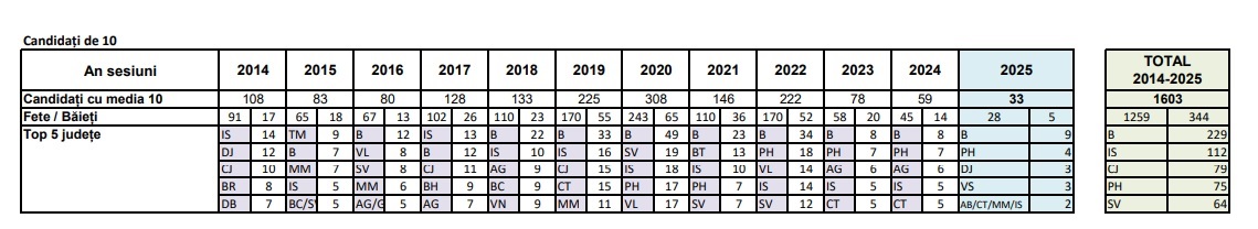Să precizăm că în acest an Clujul nu are nici un candidat care să fi obținut media 10 curat. În schimb conform datelor ministerului în ultimii zece ani la Cluj au obținut medii de 10 un număr de 79 de candidați, cei mai mulți într-un județ din țară după București cu 229 și Iași cu 112. Cea mai bună medie a obținut-o un elev de la Colegiul Național ”Andrei Mureșanu” din Dej, 9,98, urmat de nu mai puțin de cinci candidați care au obținut medii de 9,95 – de la colegiile naționale ”Emil Racoviță” din Cluj-Napoca, ”Andrei Mureșanu” din Dej și ”George Coșbuc” din Cluj-Napoca.