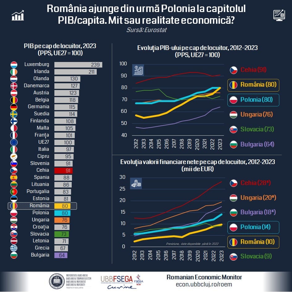 “O dată cu aceste date publicate pentru anul 2023, România mai urcă o poziție în clasamentul european al PIB-ului pe cap de locuitor, devansând deja alte 6 țări membre UE, respectiv Ungaria, Croația, Slovacia, Letonia, Grecia și Bulgaria și fiind la egalitate cu Polonia. Acest loc în clasament înseamnă că România ajunge la nivelul de 80% față de media UE în privința acestui indicator. Spre comparație, acum 10 ani, valoarea aceluiași indicator în România era de 55%”, arată analiza Romanian Economic Monitor.