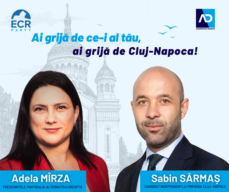 „Partidul Alternativa Dreaptă pe care îl conduc, prin filiala Alternativa Dreaptă Cluj, în urma hotărârii Biroului Executiv Municipal, își anunță susținerea fermă pentru candidatura domnului Sabin Sărmaș la funcția de primar al Municipiului Cluj-Napoca. Având în vedere experiența vastă în administrația publică și dedicarea dovedită în servirea comunității, considerăm că domnul Sabin Sărmaș este cel mai potrivit candidat pentru a conduce destinele municipiului Cluj-Napoca în următorii 4 ani. Echipa Alternativa Dreaptă Cluj este convinsă că domnul Sabin Sărmaș va aduce o viziune clară și soluții eficiente pentru dezvoltarea și bunăstarea cetățenilor, nu doar promisiuni deșarte și vise neîmplinite. Ne angajăm să-l sprijinim cu toată priceperea noastră în campania electorală și să lucrăm împreună pentru a avea un oraș mai prosper și mai sigur pentru toți locuitorii săi. Trebuie să avem grijă de ce-i al nostru”, a transmis Adela Mîrza.