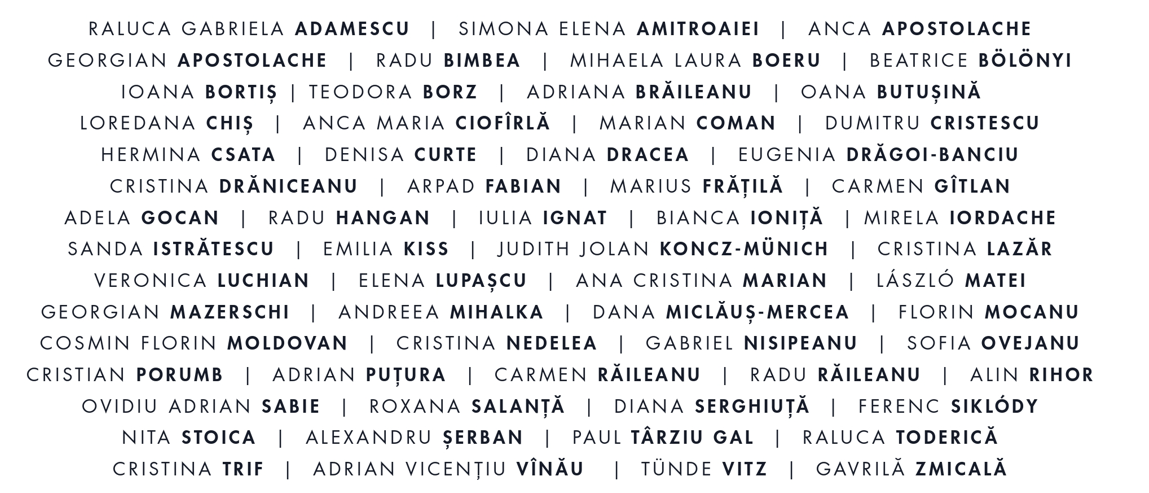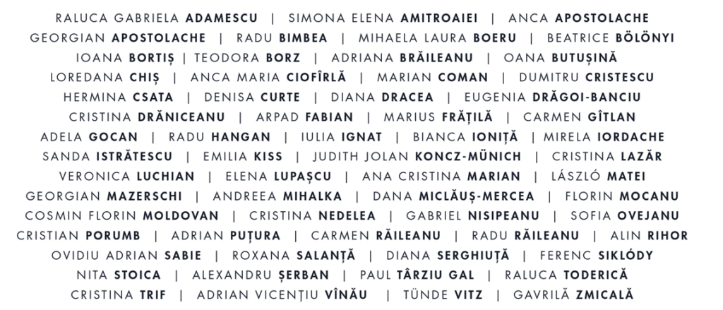 Lista expozanților: Raluca Gabriela Adamescu, Simona Elena Amitroaiei, Anca Apostolache, Georgian Apostolache, Radu Bimbea, Mihaela Laura Boeru, Beatrice Bölönyi, Ioana Bortiș, Teodora Borz, Adriana Brăileanu, Oana Butușină, Loredana Chiș, Anca Maria Ciofîrlă, Marian Coman, Dumitru Cristescu, Hermina Csata, Denisa Curte, Diana Dracea, Eugenia Drăgoi-Banciu, Cristina Drăniceanu, Arpad Fabian, Marius Frățilă, Carmen Gîtlan, Adela Gocan, Radu Hangan, Iulia Ignat, Bianca Ioniță, Mirela Iordache, Sanda Istrătescu, Emilia Kiss, Judith Jolan Koncz-Münich, Cristina Lazăr, Veronica Luchian, Elena Lupașcu, Ana Cristina Marian, László Matei, Georgian Mazerschi, Andreea Mihalka, Dana Miclăuș-Mercea, Florin Mocanu, Cosmin Florin Moldovan, Cristina Nedelea, Gabriel Nisipeanu, Sofia Ovejanu, Cristian Porumb, Adrian Puțura, Carmen Răileanu, Radu Răileanu, Alin Rihor, Ovidiu Adrian Sabie, Roxana Salanță, Diana Serghiuță, Ferenc Siklódy, Nita Stoica, Alexandru Șerban, Paul Târziu Gal, Raluca Toderică, Cristina Trif, Adrian Vicențiu Vînău, Tünde Vitz, Gavrilă Zmicală.