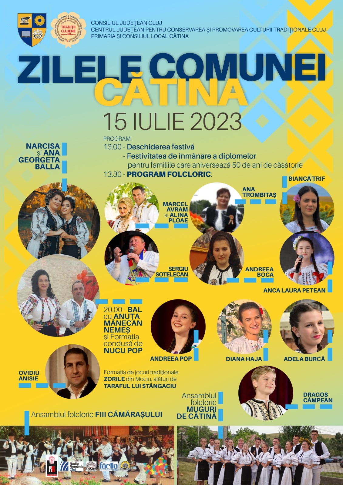 Zilele comunei Cătina sunt de fapt o zi, sâmbătă 15 iulie, au ajuns la a XII-a ediție. Programul începe la ora 13 în parcul ”Între brazi”, cu deschiderea festivă, când vor fi aniversate și premiate cuplurile care au împlinit 50 de ani de căsătorie. La ora 13.30 e programat un program folcloric, în cadrul căruia vor evolua mai multe ansambluri folclorice și interpreți vocali – Ana Georgeta Balla și Narcisa Balla, Sergiu Sotelecan, Marcel Avram și Alina Ploae, Ovidiu Anisie, Ana Trombitaș, Andreea Boca, Bianca Trif, Anca Laura Petean, Andreea Pop, Diana Haja, Adela Burcă și Dragoș Câmpean. Jocurile tradiționale vor fi aduse în scenă de Formația de jocuri ”Zorile” din Mociu, alături de Taraful lui Stângaciu, dar și de Ansamblurile folclorice ”Muguri de Cătină” și ”Fiii Cămărașului”. Evenimentul se va încheia cu un bal, alături de Anuța Mânecan și Nucu de la Fizeș.
