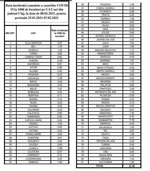 Mai jos rata de infectare în fiecare oraș și comună din Cluj: