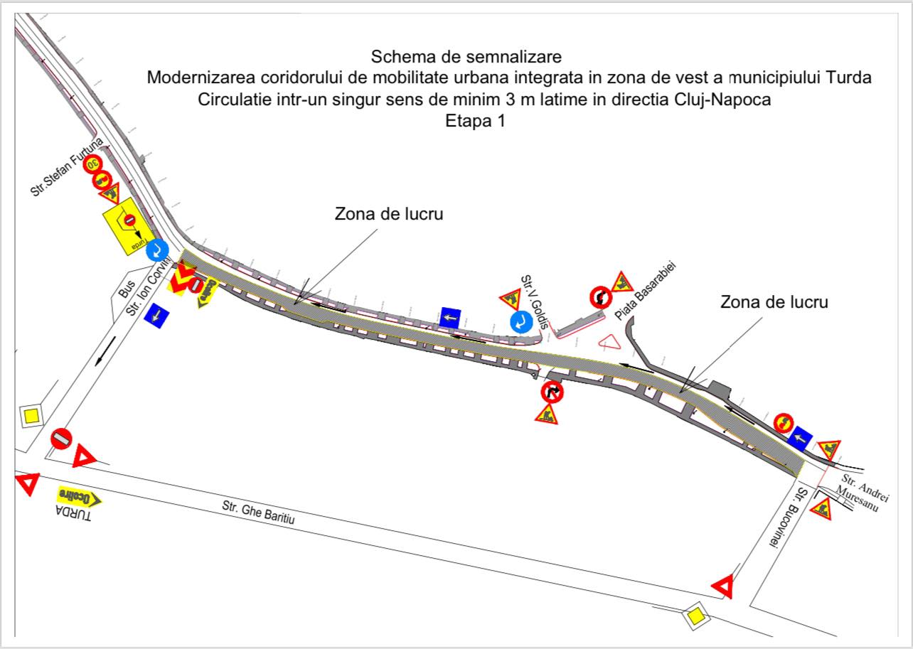 În acest context stația de transport în comun de pe strada Simion Bărnuțiu 29 se va muta pe strada Ion Corvin 6. Devierea circulației spre Alba-Iulia si Târgu-Mureș se va face pe străzile Ion Corvin si Gheorghe Baritiu. ”Restricționarea acestei porțiuni este necesară în vederea executării lucrărilor de modernizare cuprinse în Planul de Mobilitate Urbană Durabilă, coridorul de vest”, arată Primăria Turda.