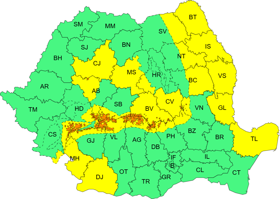 Pentru zona montană sunt în vigoare avertizări Cod Galben și Cod Portocaliu de viscol puternic. La altitudini de peste 1500 de metri, în Carpații Meridionali și local în Carpații de Curbură, rafalele vor ajunge la 80–110 km/h, iar vizibilitatea poate scădea sub 50 de metri.