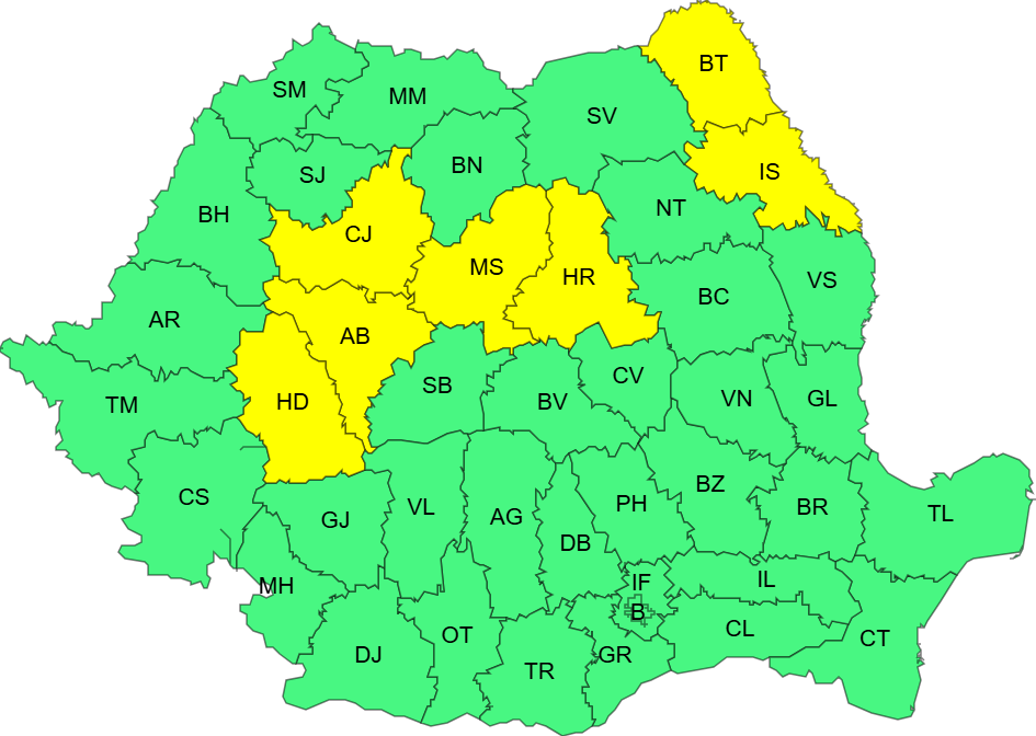 Avertizarea de ger e valabilă din această dimineață până diseară la ora 20. În acest interval, în județele Botoșani, Iași, Harghita, Mureș, Cluj, Alba și Hunedoara, vor continua să se înregistreze temperaturi deosebit de scăzute – în medie cu până la 9 grade mai mici decât cele normale datei, cu valori ce se vor încadra între -8 și -4 grade, mai scăzute până în jurul a -10 grade, pe văi și în depresiuni, unde gerul va persista.