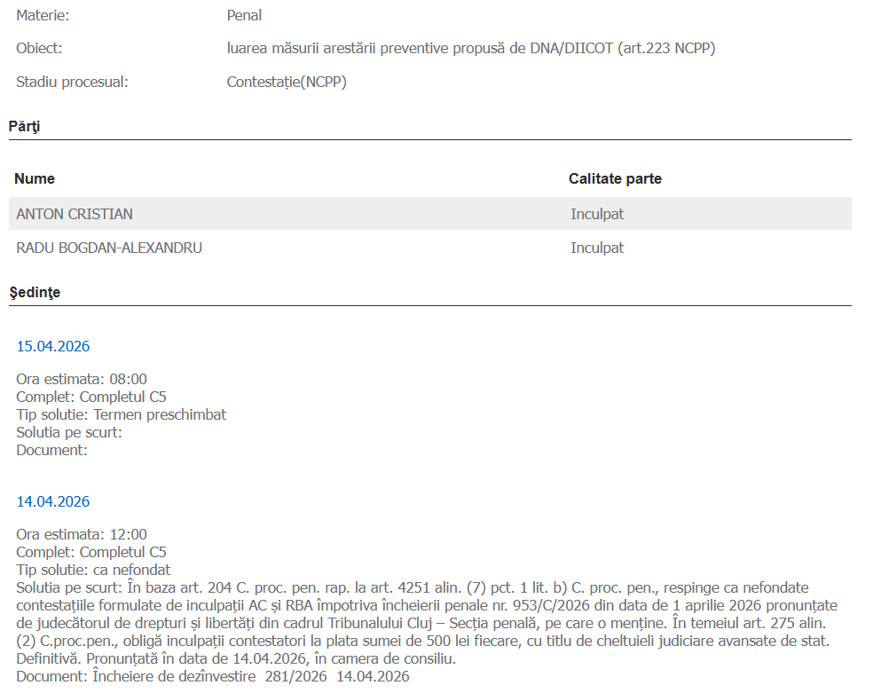 Decizia a fost pronunțată în camera de consiliu și este definitivă. Instanța a menținut încheierea penală din 1 aprilie 2026 a Tribunalului Cluj, și a respins contestațiile ca nefondate.