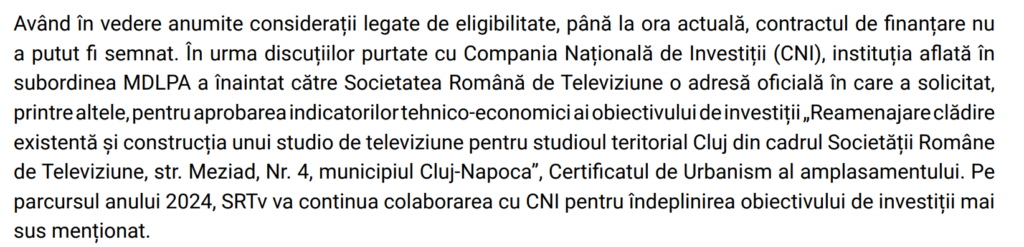 Pentru a doua oară consecutiv în ultimii ani raportul nu menționează starea clădirii din Mănăștur primită de TVR la schimb cu clădirea Casino-ului din parcul central de la Primărie, clădire aflată acum, de ani de zile, în vădită stare de degradare, fără spectrul îmbunătățirilor – aici detalii.