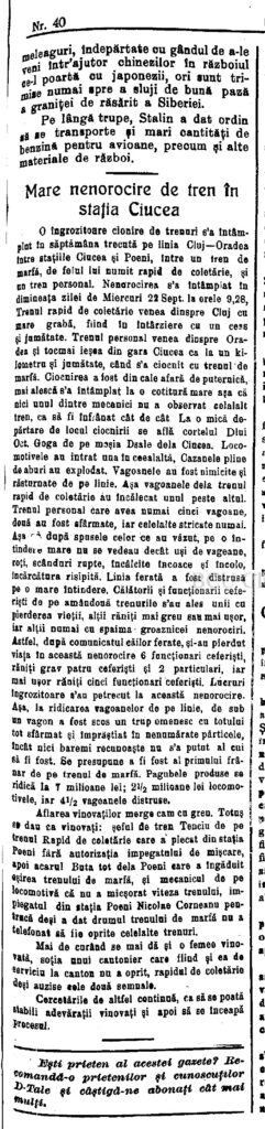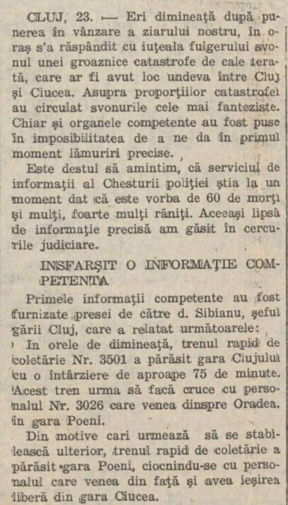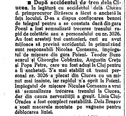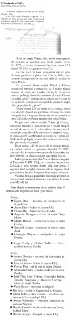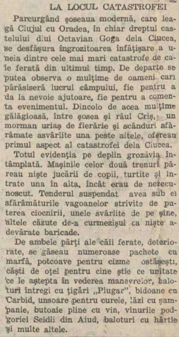 În dimineața de 22 septembrie 1937, un tren personal cu șase vagoane care urma să plece din gara Ciucea spre Cluj a primit semnalul de plecare și a ieșit pe linie. La doar circa 500 de metri de gară, acesta s-a ciocnit frontal cu un tren de coletărie care circula cu viteză spre Oradea. Conform relatărilor din presa interbelică, impactul a fost violent — locomotivele și remorcile cu cărbuni, numite tendere, au fost distruse, iar vagoanele au fost puternic avariate, producând un zgomot și un huruit puternic descris de martori.