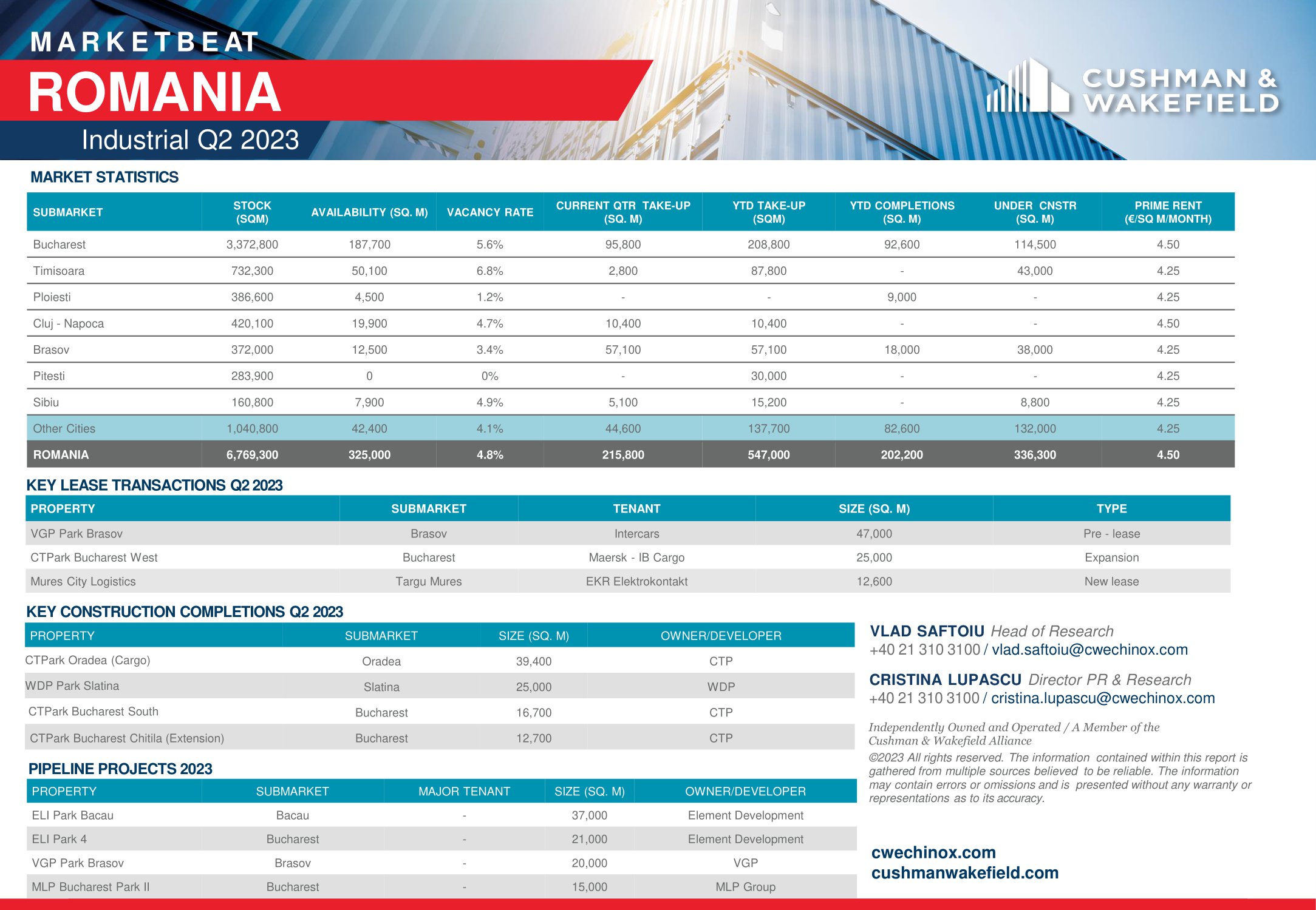 Activitatea de închiriere pe piața imobiliară industrială și logistică a înregistrat în perioada martie-iunie un alt trimestru puternic, fiind tranzacționați peste 215.000 metri pătrați, astfel că volumul tranzacționat în prima jumătate a anului a crescut ușor în comparație cu prima jumătate a anului trecut. ”Cererea nouă continuă să fie principalul motor al pieței, (90% din suprafața totală închiriată în al doilea trimestru 2023 și 72% din cererea din primul semestru 2023), provenind din sectoare variate de activitate, printre cele mai active fiind retail-ul, distribuția de mărfuri generale, industria componentelor auto și logistica”, arată analiza.