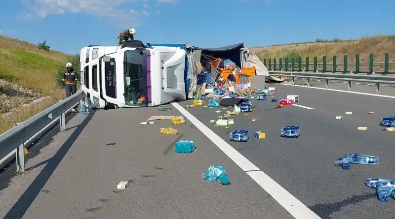 Un camion încărcat cu produse s-a răsturnat pe Autostrada Transilvania, circulația a fost blocată.