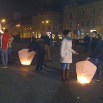 „Anul trecut am lansat 1000 la un eveniment similar”, își amintesc membri ai Clubului clujean aflați în micul cort pentru comercializarea lampioanelor. „Anul acesta s-a dat aviz pentru mai puține. 200-300. Și anul trecut lansarea s-a făcut cu autorizație”, spun reprezentanți ai clubului din spatele mesei de unde s-au vândut lampioane spre a fi lansate de ziua onomastică a Regelui Mihai I. Pe aceeași masă este o cutie în care se strâng mesaje de la clujeni pentru Rege. Lângă cutie e și o peteție: pentru instaurarea Monarhiei în România care fusese semnată de 16 persoane, la o oră de la debutul manifestării cu lampioane.