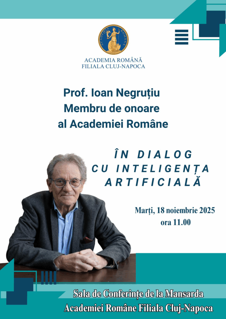 Manifestarea are loc marți la ora 11 în sala de conferințe de la mansardă a filialei din Cluj a Academiei Române, invitat este Ioan Negruțiu, membru de onoare al Academiei Române. Moderată de academicianul Dorel Banabic, președintele Secției de științe tehnice a Academiei Române, manifestarea propune un dialog pe marginea volumului ”In conversation with AI – Questioning artificial intelligence on human sensitive issue as of 2025” publicat recent de Negruțiu, în colecția Biblioteca de Științe a Editurii Academiei Române. Bazat pe o examinare critică a condiției umane și a lumii contemporane, volumul, publicat în limba engleză, explorează felul în care inteligența artificială (IA) devine atât martor, cât și instrument de reflecție asupra transformărilor profunde ale civilizației, arată gazdele. Volumul și discuția de marți tratează întrebări esențiale și riscuri sistemice ignorate, dar și impactul socio-ecologic al dezvoltării tehnologiei. ”Cartea reprezintă o călătorie surprinzătoare (sic-n.red.) în adâncimile condiției umane cotidiene, în aspecte pe care adesea le ignorăm sau alegem să nu le vedem, mai ales la nivel colectiv”, spune Negruțiu. ”Experiența acestei lecturi, în care un sistem de gândire conceput de om este procesat și reflectat de un ‘creier digital iscusit’, oferă cititorilor ceva profund important asupra căruia să reflecte și pe baza căruia să acționeze”. Intrarea e liberă.