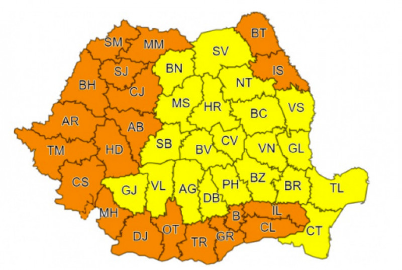 Pentru sâmbătă a fost emis și un cod portocaliu de căldură în intensificare și disconfort termic accentuat. În Banat, cea mai mare parte a Crișanei, sudul Olteniei și al Munteniei se vor înregistra temperaturi maxime în general de 37…38 de grade, iar minimele se vor situa între 19 și 26 de grade, astfel încât disconfortul termic va fi accentuat. Indicele temperatură-umezeală (ITU) va depăși pragul critic de 80 de unități.