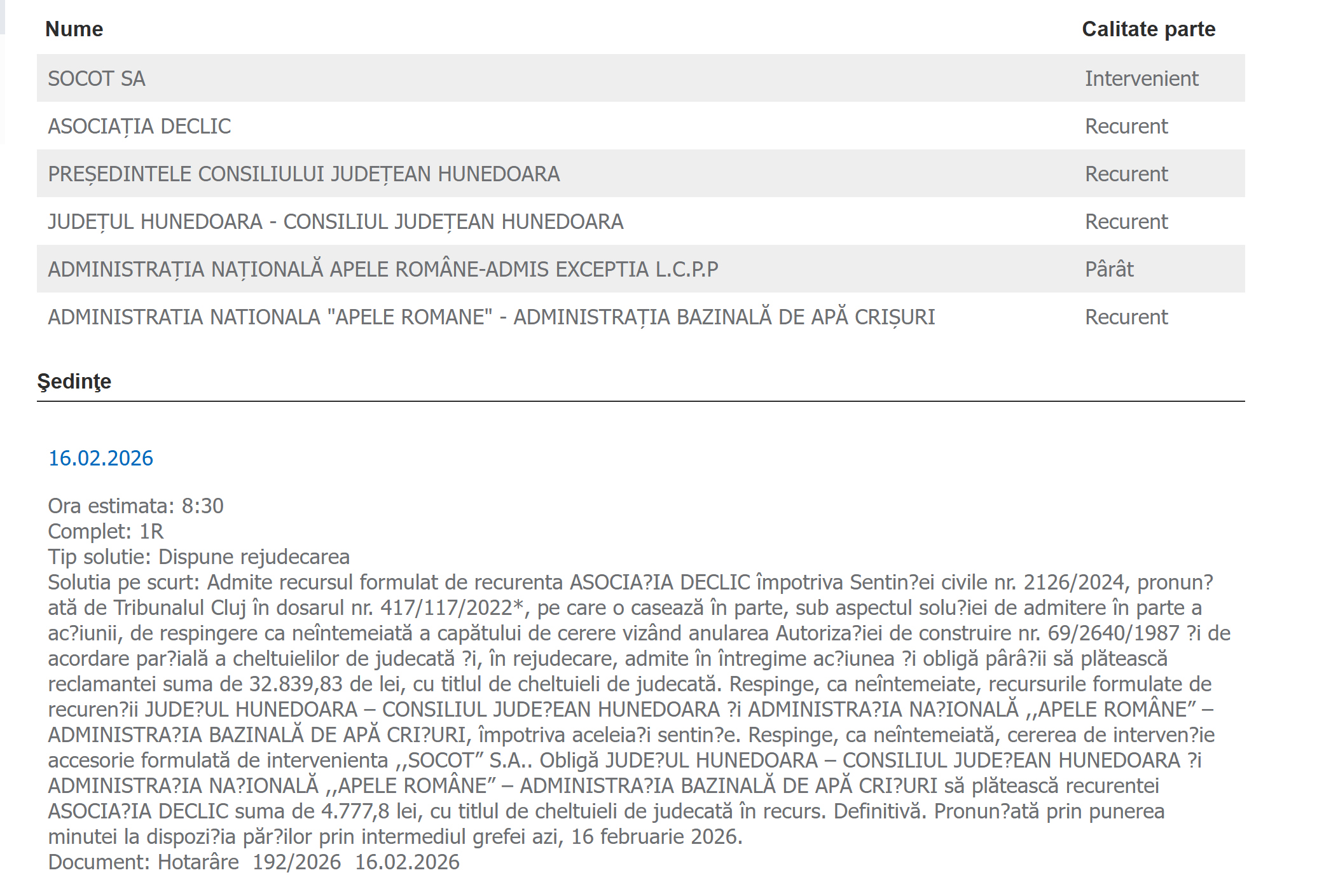 Curtea de Apel Cluj a admis ieri recursul Declic și a decis anularea autorizației de construcție și constatarea caducității autorizației emise în anul 1987 pentru Barajul Mihăileni. Instanța a stabilit că lucrările nu pot continua fără o autorizație valabilă și actualizată. Judecătorii confirmă astfel că proiectul nu poate fi dus mai departe pe baza unor acte administrative vechi de aproape 40 de ani, după decenii de abandon și schimbări majore ale acestuia.