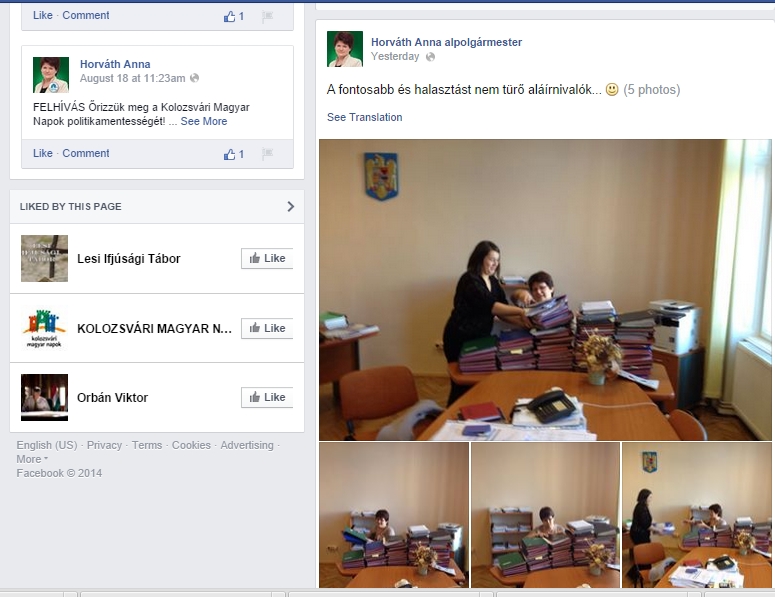 Dacă vrei să vezi ce a mai făcut viceprimarul și nu cunoști limba magiară, există însă poze reprezentative care o arată, în Sala de Sticlă, există fotografii din biroul viceprimarului, din sediul de pe Moților 1-3 cu maldăre de dosare care trebuie semnate. Postările sunt însă în limba maghiară și nu, bilingv, așa cum, în calitate de reprezentantă a comunității maghiare o solicită de fiecare dată.